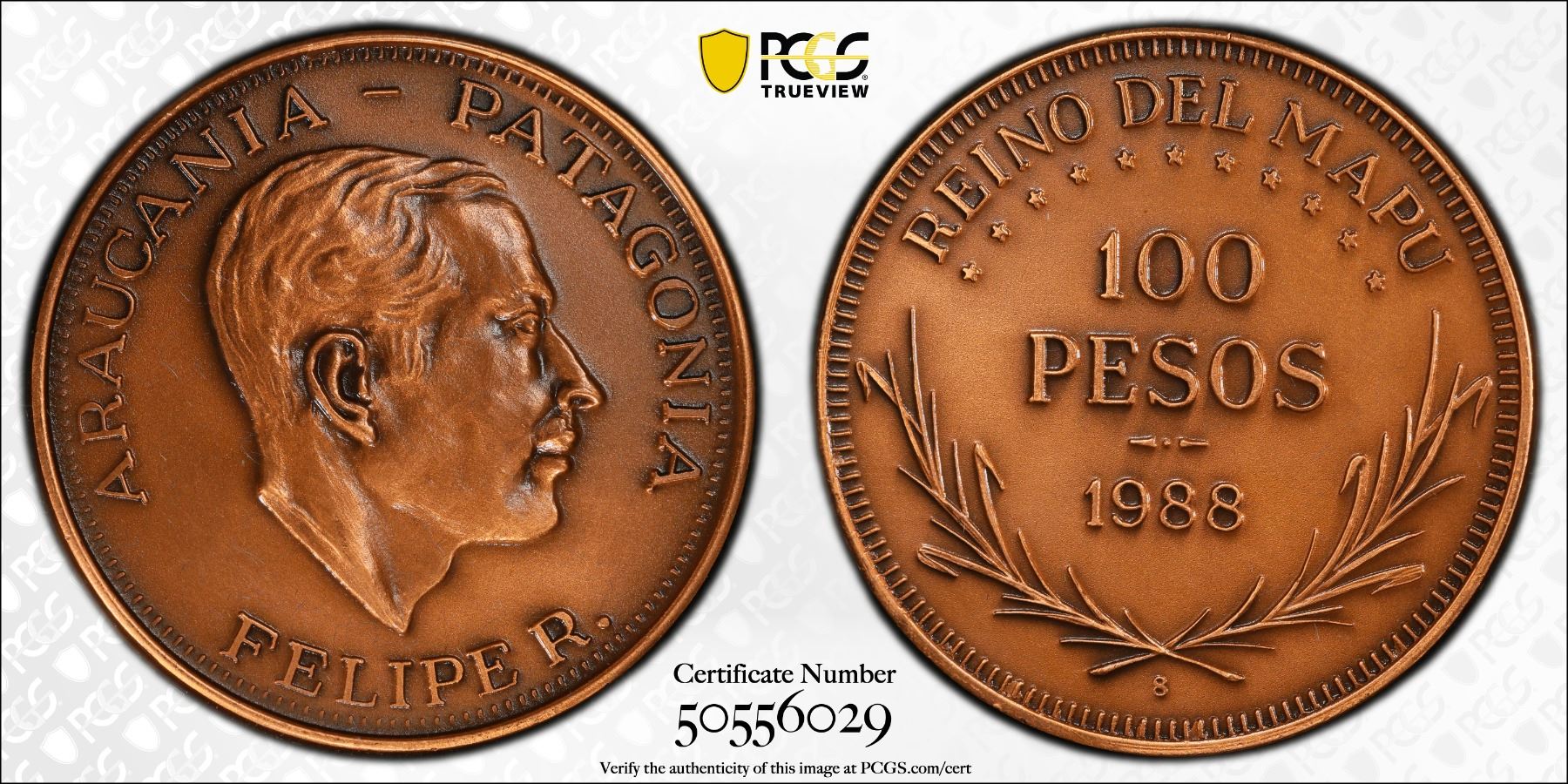 ARAUCANIA AND PATAGONIA: Felipe I, 1952-2014, 100 pesos, 1988, PCGS Specimen 63