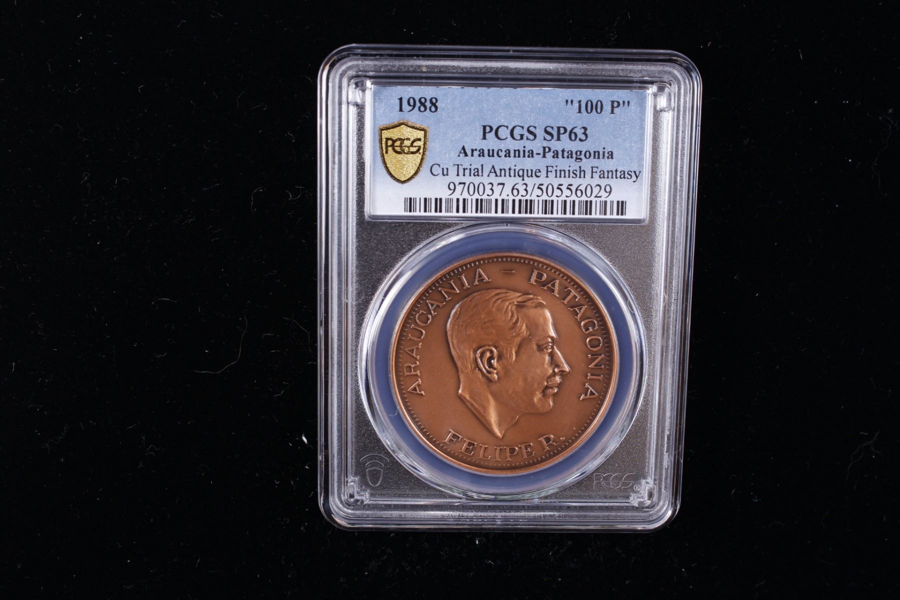 ARAUCANIA AND PATAGONIA: Felipe I, 1952-2014, 100 pesos, 1988, fantasy issue struck in antiqued bronze, first issue of Felipe I, PCGS graded Specimen 63. Philippe Paul Alexandre Henri Boiry (1927-2014) was a journalist and a pretender to the throne of the Kingdom of Araucanía and Patagonia from October 26, 1952 to January 5, 2014. This fantasy type was struck at the Maison de Frappe FDC, a private mint in Quebec, by Serge Huard. See http://www.araucanie.com/Muenzen.pdf for more information.