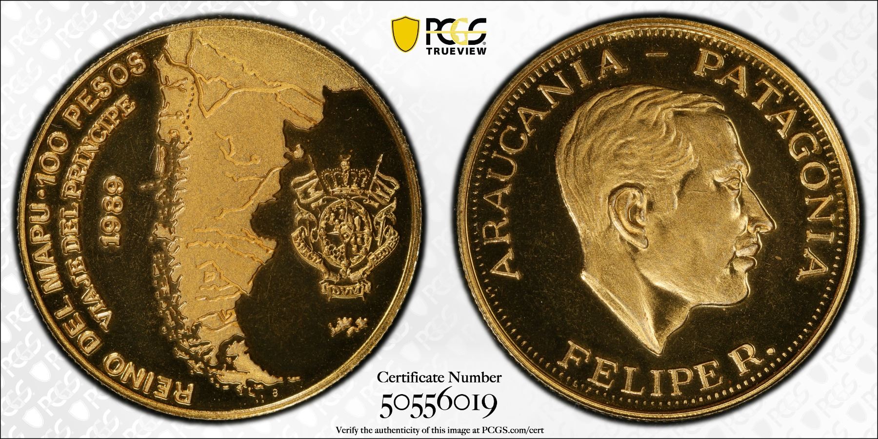 ARAUCANIA AND PATAGONIA: Felipe I, 1952-2014, 100 pesos, 1989, PCGS Specimen 67