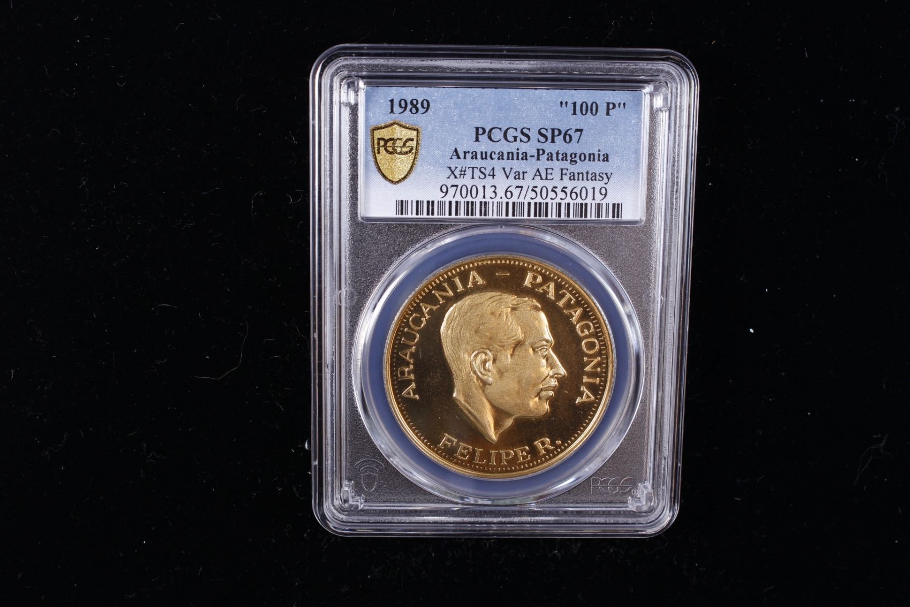 ARAUCANIA AND PATAGONIA: Felipe I, 1952-2014, 100 pesos, 1989, KM-XTS4, fantasy issue struck in gilt bronze, First Visit of the Prince, PCGS graded Specimen 67. Philippe Paul Alexandre Henri Boiry (1927-2014) was a journalist and a pretender to the throne of the Kingdom of Araucanía and Patagonia from October 26, 1952 to January 5, 2014. This fantasy type was struck at the Maison de Frappe FDC, a private mint in Quebec, by Serge Huard. See http://www.araucanie.com/Muenzen.pdf for more information.