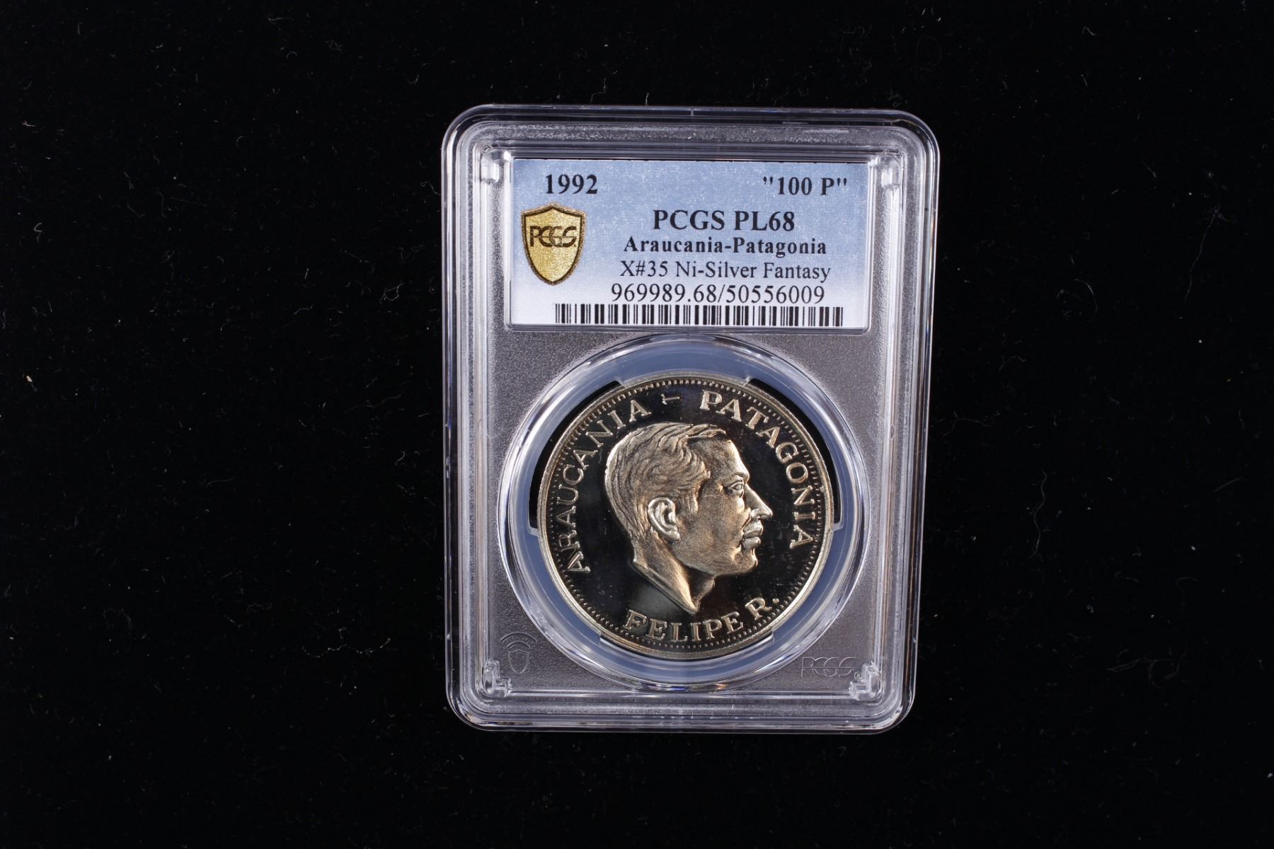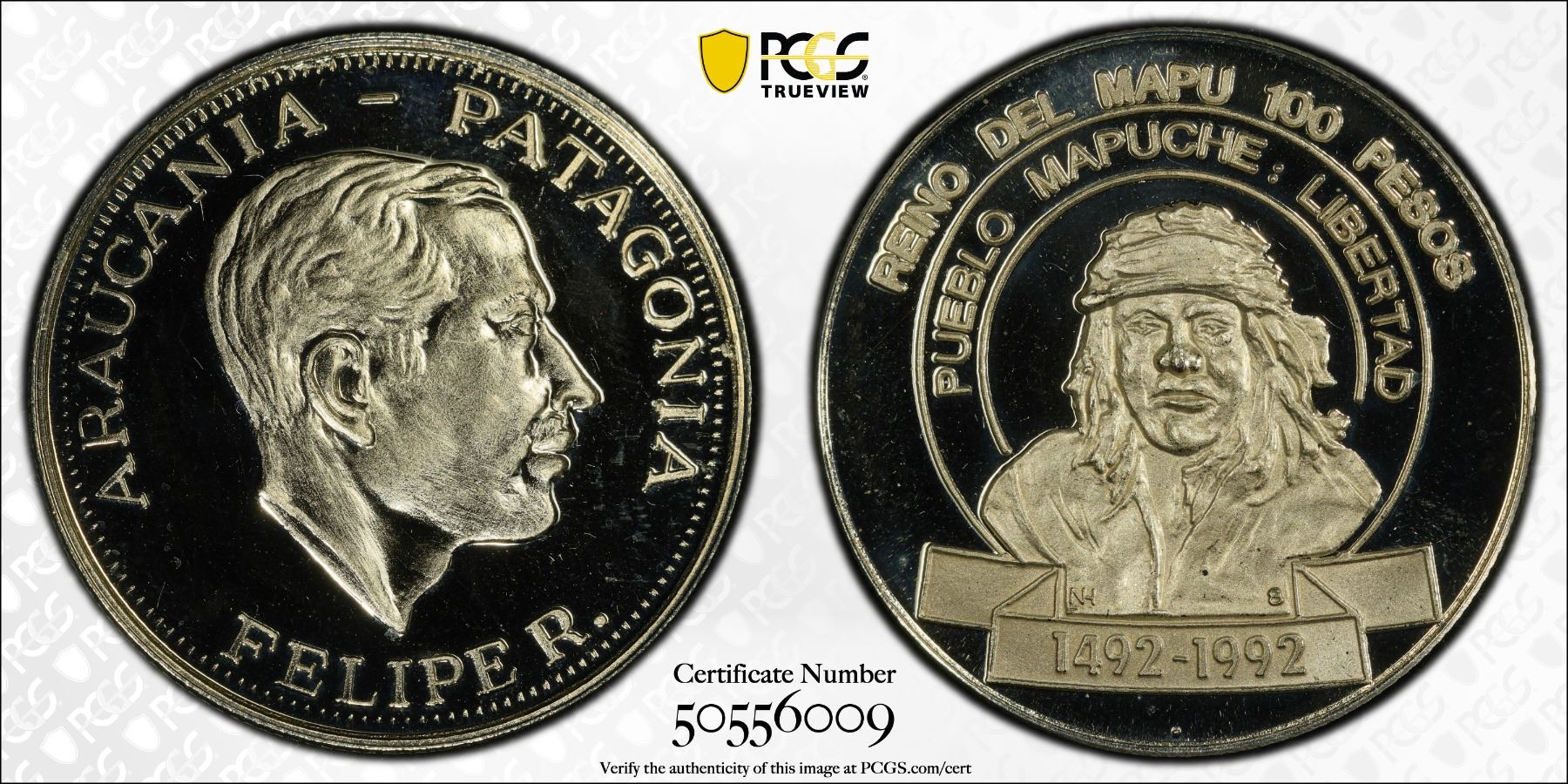 ARAUCANIA AND PATAGONIA: Felipe I, 1952-2014, 100 pesos, 1992, KM-X35, fantasy issue struck in nickel-silver, Cacique Quilipan portrait - Pueblo Mapuche: Libertad 1492-1992, PCGS graded MS68 PL. Philippe Paul Alexandre Henri Boiry (1927-2014) was a journalist and a pretender to the throne of the Kingdom of Araucanía and Patagonia from October 26, 1952 to January 5, 2014. This fantasy type was struck at the Maison de Frappe FDC, a private mint in Quebec, by Serge Huard. See http://www.araucanie.com/Muenzen.pdf for more information.