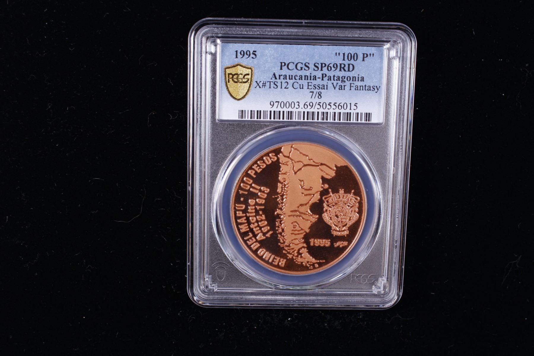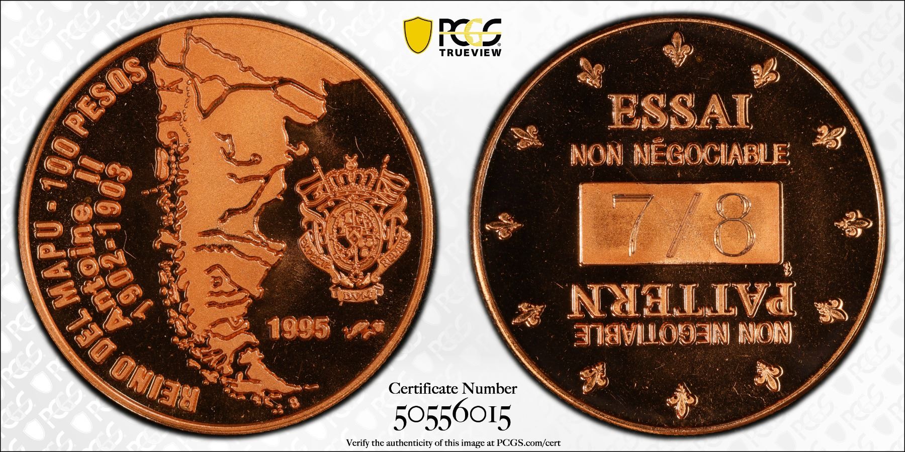 ARAUCANIA AND PATAGONIA: Felipe I, 1952-2014, 100 pesos, 1995, KM-XTS12, fantasy issue essai reverse die trial struck in bronze, Dynasty Series - Antoine II 1902-1903, numbered 7 of a mintage of only 8 coins, PCGS graded Specimen 69 RD. Philippe Paul Alexandre Henri Boiry (1927-2014) was a journalist and a pretender to the throne of the Kingdom of Araucanía and Patagonia from October 26, 1952 to January 5, 2014. This fantasy type was struck at the Maison de Frappe FDC, a private mint in Quebec, by Serge Huard. See http://www.araucanie.com/Muenzen.pdf for more information.