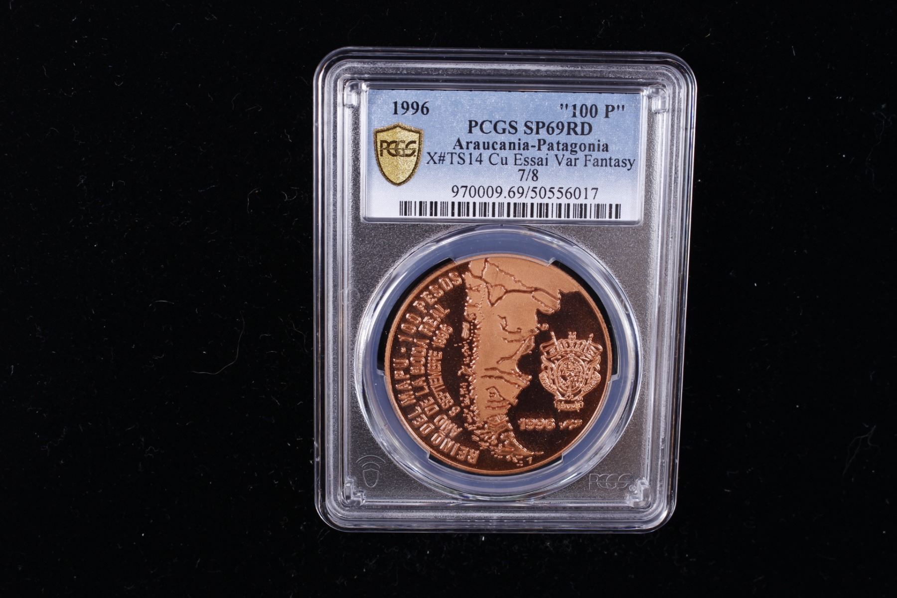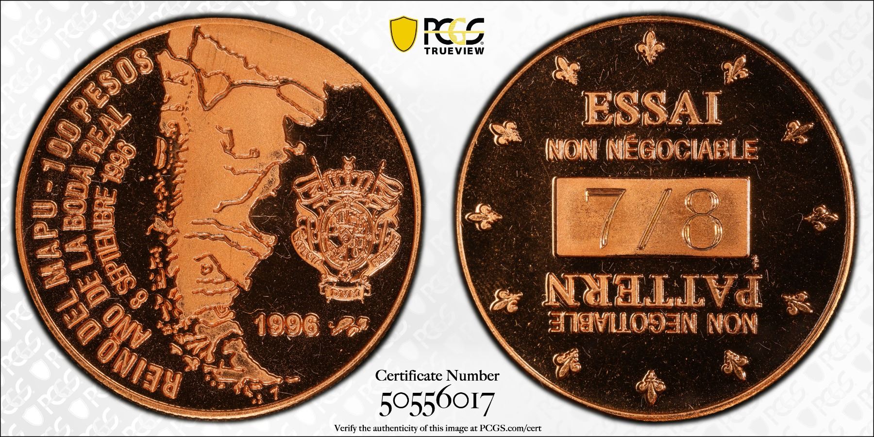 ARAUCANIA AND PATAGONIA: Felipe I, 1952-2014, 100 pesos, 1996, KM-XTS14, fantasy issue essai reverse die trial struck in bronze, Royal Wedding, numbered 7 of a mintage of only 8 coins, extremely rare, PCGS graded Specimen 69 RD. Philippe Paul Alexandre Henri Boiry (1927-2014) was a journalist and a pretender to the throne of the Kingdom of Araucanía and Patagonia from October 26, 1952 to January 5, 2014. This fantasy type was struck at the Maison de Frappe FDC, a private mint in Quebec, by Serge Huard. See http://www.araucanie.com/Muenzen.pdf for more information.