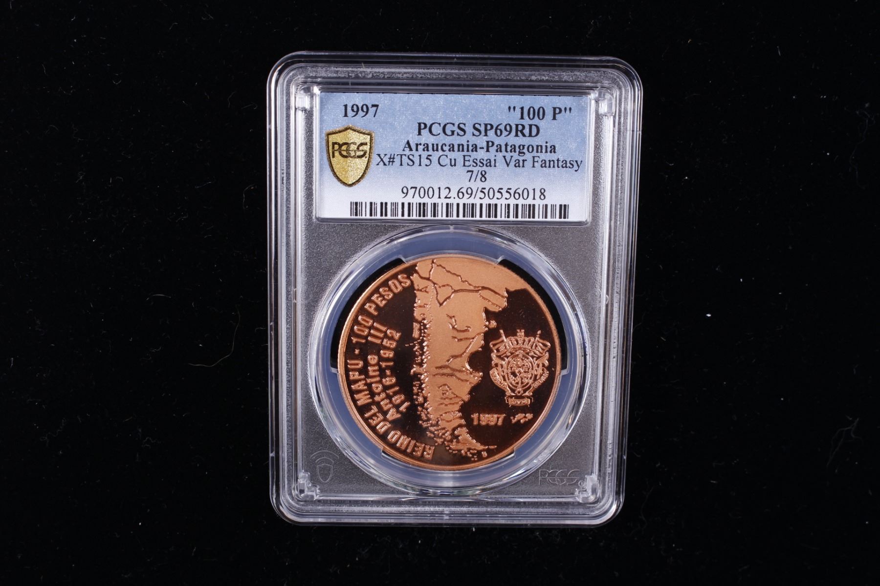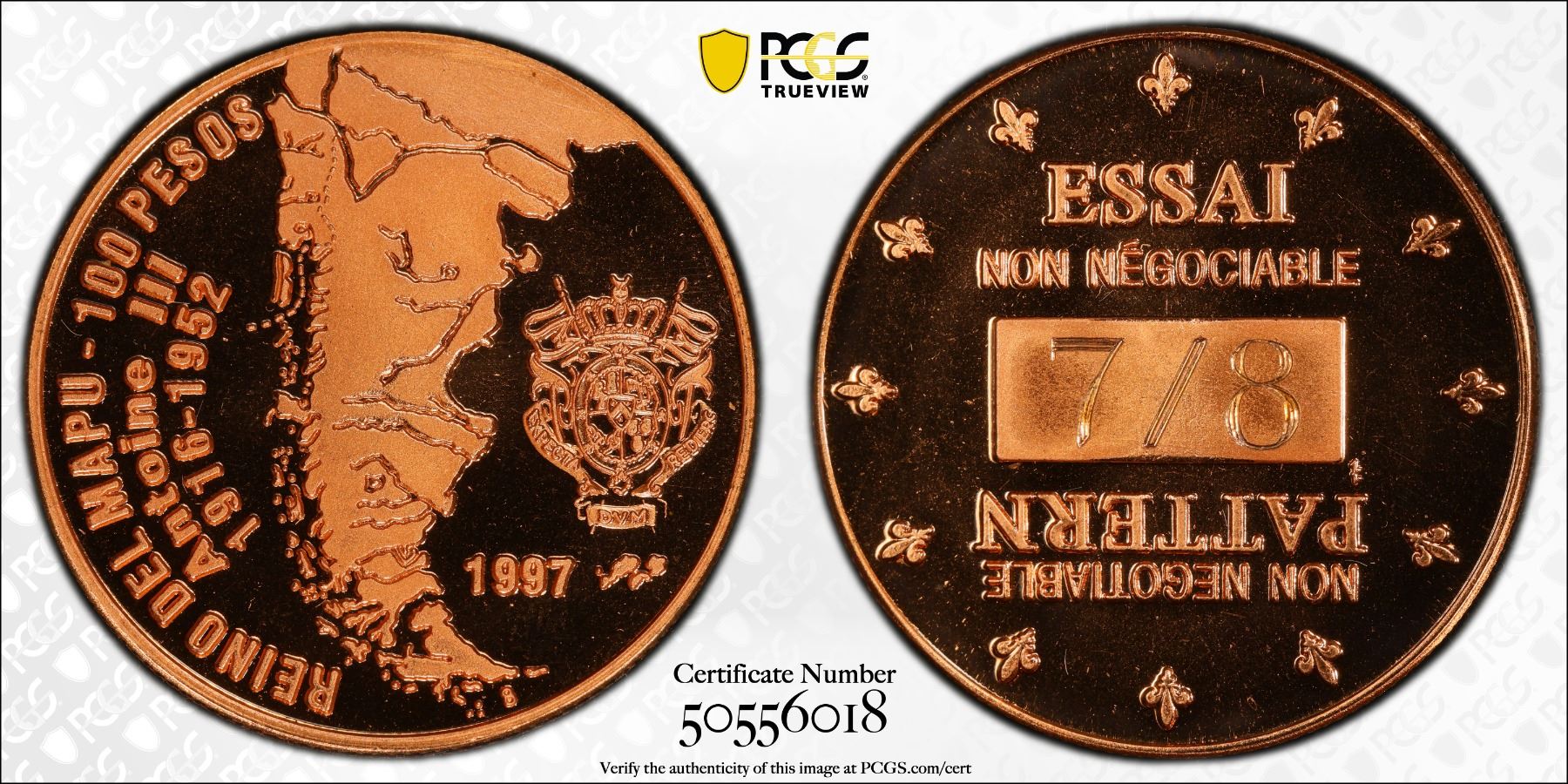 ARAUCANIA AND PATAGONIA: Felipe I, 1952-2014, 100 pesos, 1997, KM-XTS15, fantasy issue essai reverse die trial struck in bronze, Dynasty Series - Antoine III 1916-1952, numbered 7 of a mintage of only 8 coins, extremely rare, PCGS graded Specimen 69 RD. Philippe Paul Alexandre Henri Boiry (1927-2014) was a journalist and a pretender to the throne of the Kingdom of Araucanía and Patagonia from October 26, 1952 to January 5, 2014. This fantasy type was struck at the Maison de Frappe FDC, a private mint in Quebec, by Serge Huard. See http://www.araucanie.com/Muenzen.pdf for more information.