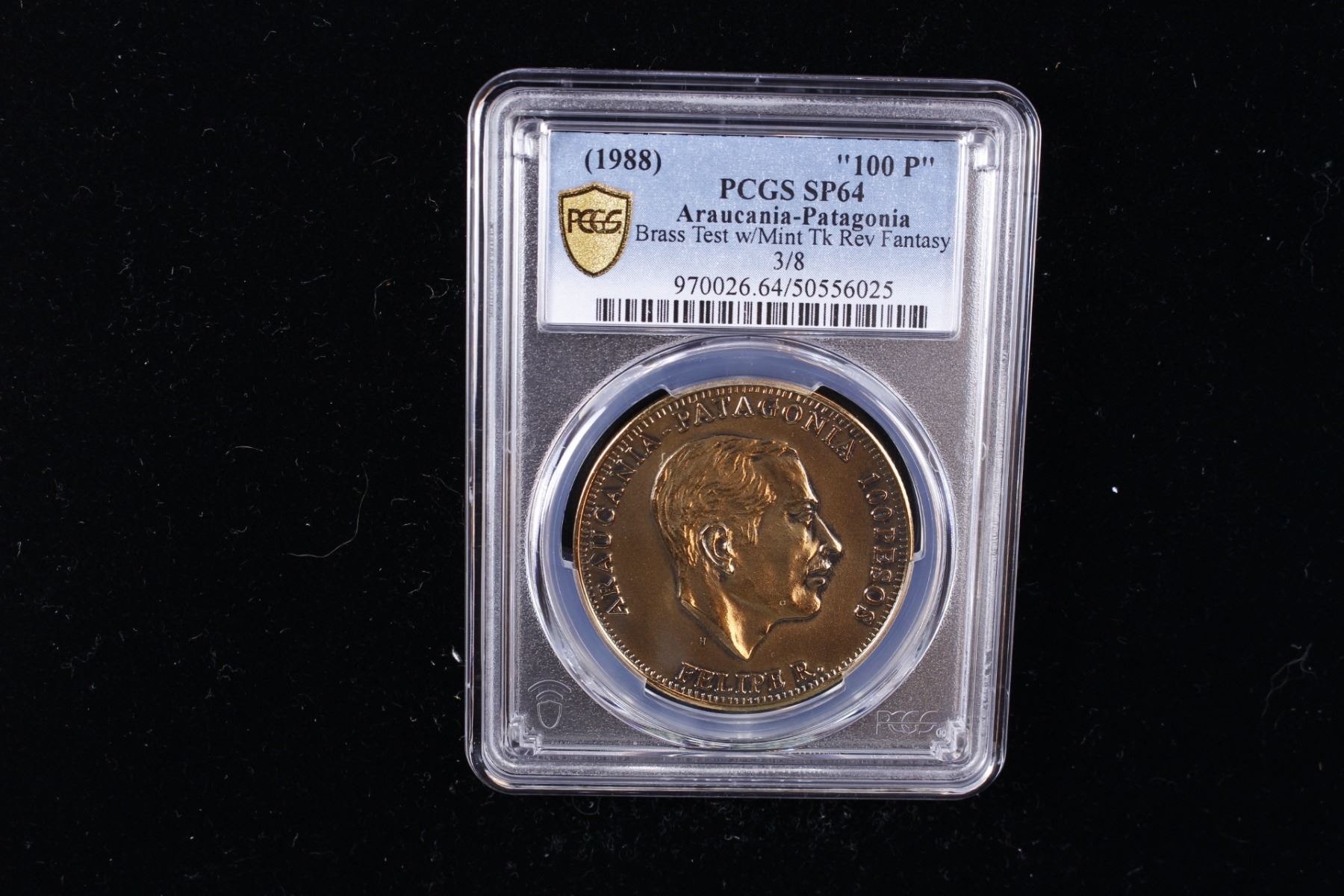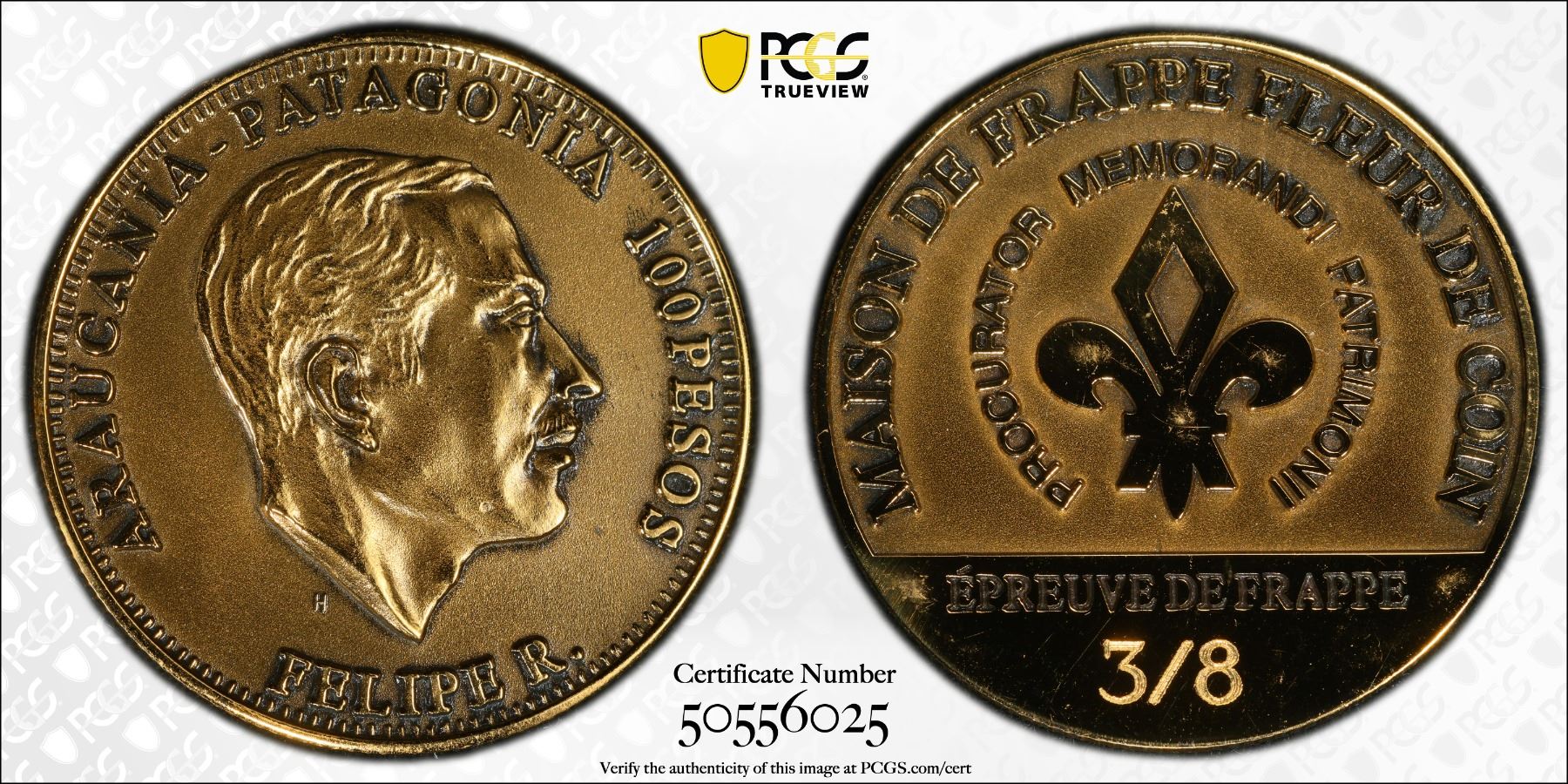 ARAUCANIA AND PATAGONIA: Felipe I, 1952-2014, 100 pesos, ND (1988), fantasy issue mule struck in antiqued gilt bronze, standard Felipe I portrait obverse muled with Maison de Frappe token reverse and numbered 3 of a mintage of only 8 coins, extremely rare, PCGS graded Specimen 64. Philippe Paul Alexandre Henri Boiry (1927-2014) was a journalist and a pretender to the throne of the Kingdom of Araucanía and Patagonia from October 26, 1952 to January 5, 2014. This fantasy type was struck at the Maison de Frappe FDC, a private mint in Quebec, by Serge Huard. See http://www.araucanie.com/Muenzen.pdf for more information.