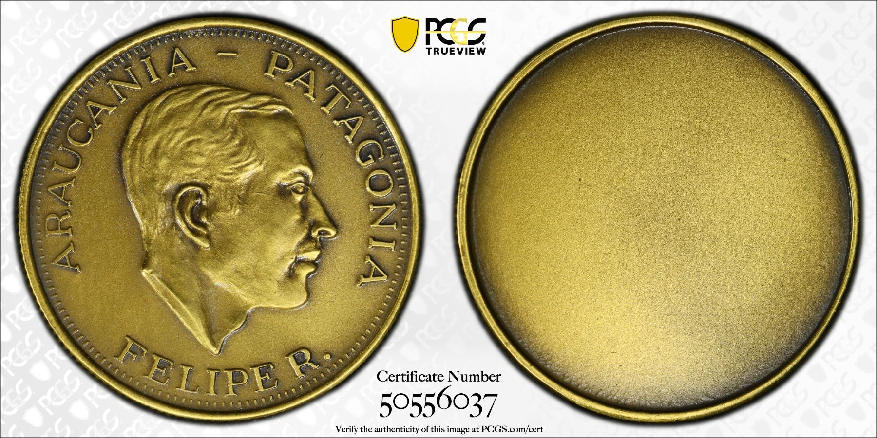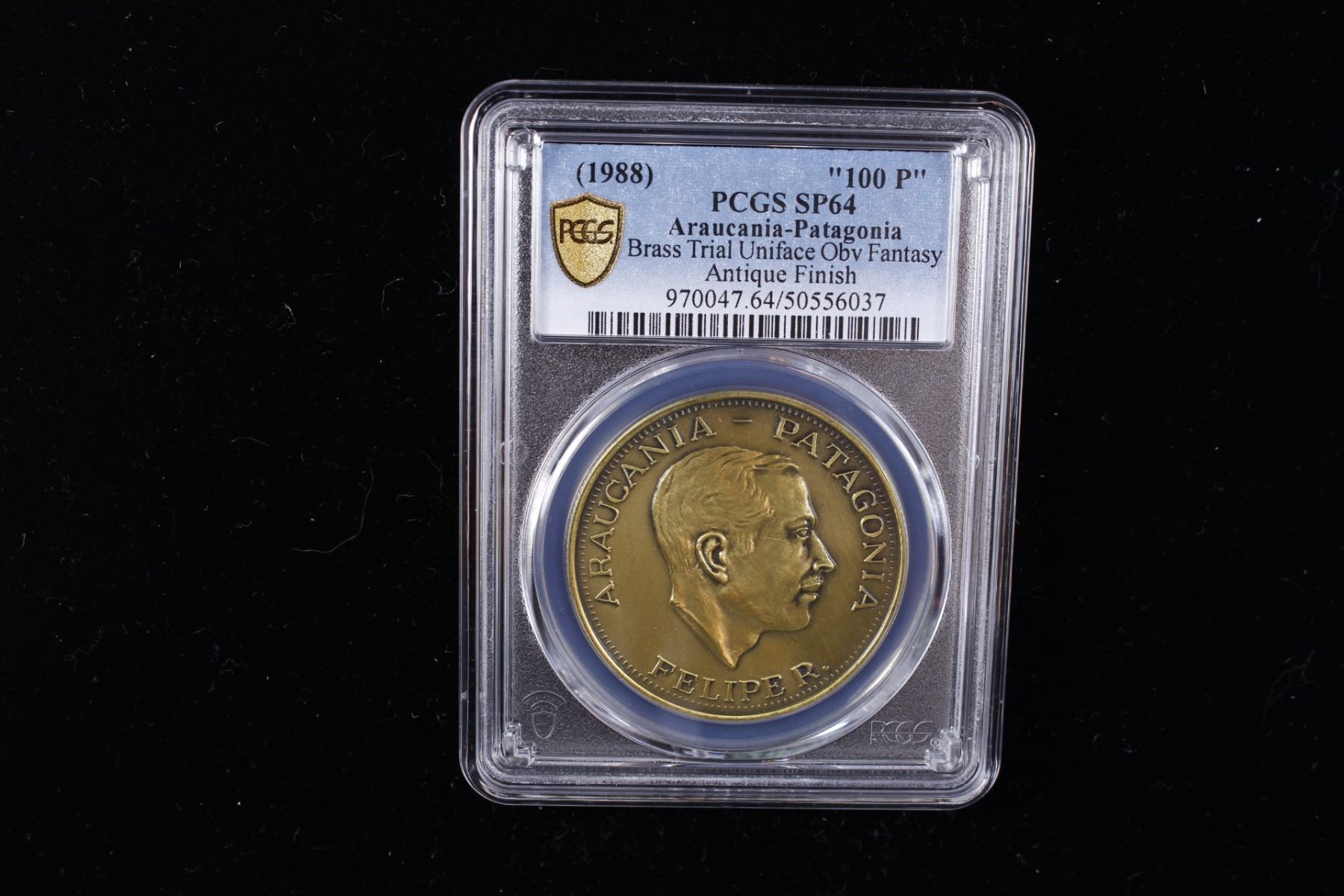 ARAUCANIA AND PATAGONIA: Felipe I, 1952-2014, 100 pesos, ND (1988), fantasy issue obverse die trial struck in antiqued brass, first issue of Felipe I, PCGS graded Specimen 64. Philippe Paul Alexandre Henri Boiry (1927-2014) was a journalist and a pretender to the throne of the Kingdom of Araucanía and Patagonia from October 26, 1952 to January 5, 2014. This fantasy type was struck at the Maison de Frappe FDC, a private mint in Quebec, by Serge Huard. See http://www.araucanie.com/Muenzen.pdf for more information.