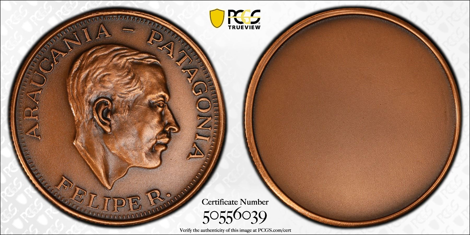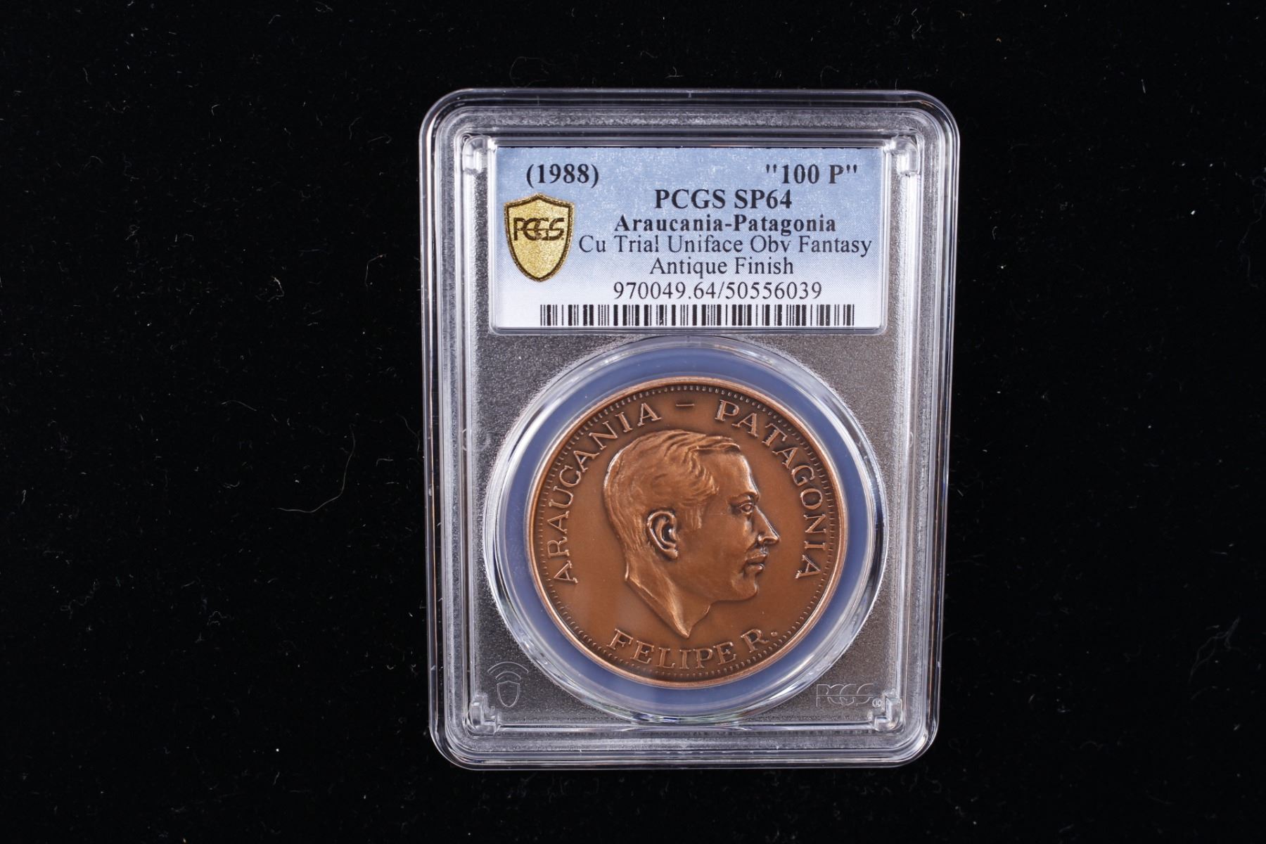 ARAUCANIA AND PATAGONIA: Felipe I, 1952-2014, 100 pesos, ND (1988), fantasy issue obverse die trial struck in antiqued copper, first issue of Felipe I, PCGS graded Specimen 64. Philippe Paul Alexandre Henri Boiry (1927-2014) was a journalist and a pretender to the throne of the Kingdom of Araucanía and Patagonia from October 26, 1952 to January 5, 2014. This fantasy type was struck at the Maison de Frappe FDC, a private mint in Quebec, by Serge Huard. See http://www.araucanie.com/Muenzen.pdf for more information.