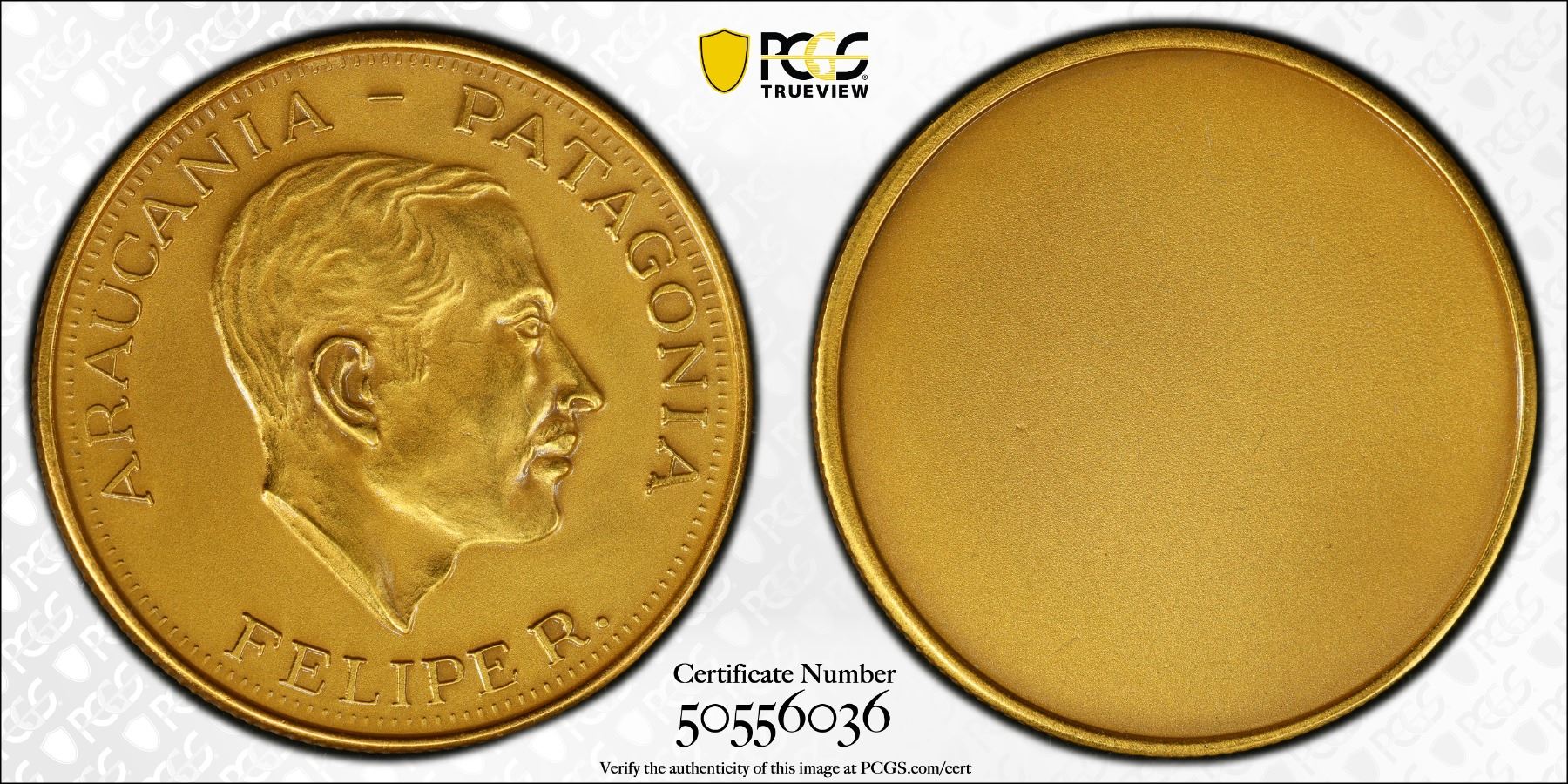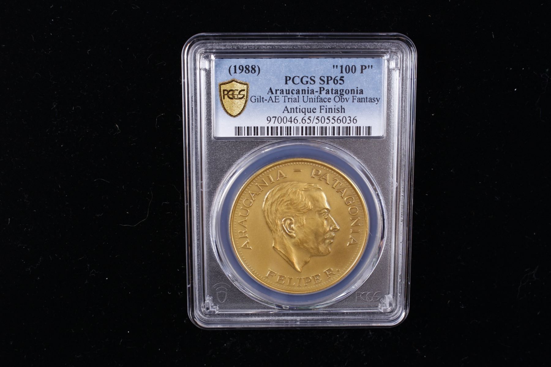 ARAUCANIA AND PATAGONIA: Felipe I, 1952-2014, 100 pesos, ND (1988), fantasy issue obverse die trial struck in antiqued gilt bronze, first issue of Felipe I, PCGS graded Specimen 65. Philippe Paul Alexandre Henri Boiry (1927-2014) was a journalist and a pretender to the throne of the Kingdom of Araucanía and Patagonia from October 26, 1952 to January 5, 2014. This fantasy type was struck at the Maison de Frappe FDC, a private mint in Quebec, by Serge Huard. See http://www.araucanie.com/Muenzen.pdf for more information.