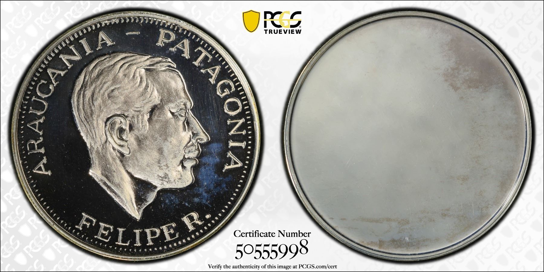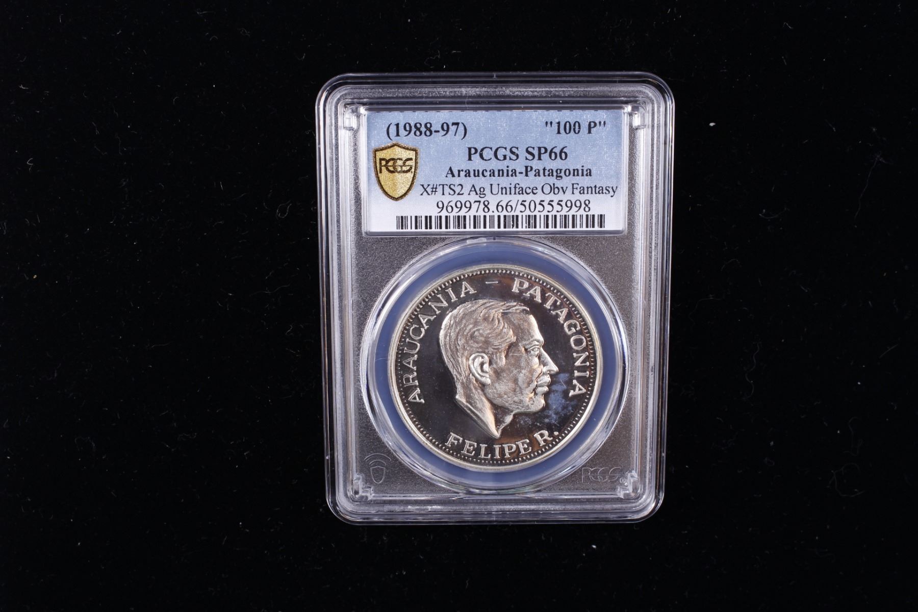 ARAUCANIA AND PATAGONIA: Felipe I, 1952-2014, AR 100 pesos, 1989, KM-TS2, fantasy issue silver obverse die trial strike, mintage of only 2 coins, extremely rare, PCGS graded Specimen 66. Philippe Paul Alexandre Henri Boiry (1927-2014) was a journalist and a pretender to the throne of the Kingdom of Araucanía and Patagonia from October 26, 1952 to January 5, 2014. This fantasy type was struck at the Maison de Frappe FDC, a private mint in Quebec, by Serge Huard. See http://www.araucanie.com/Muenzen.pdf for more information.