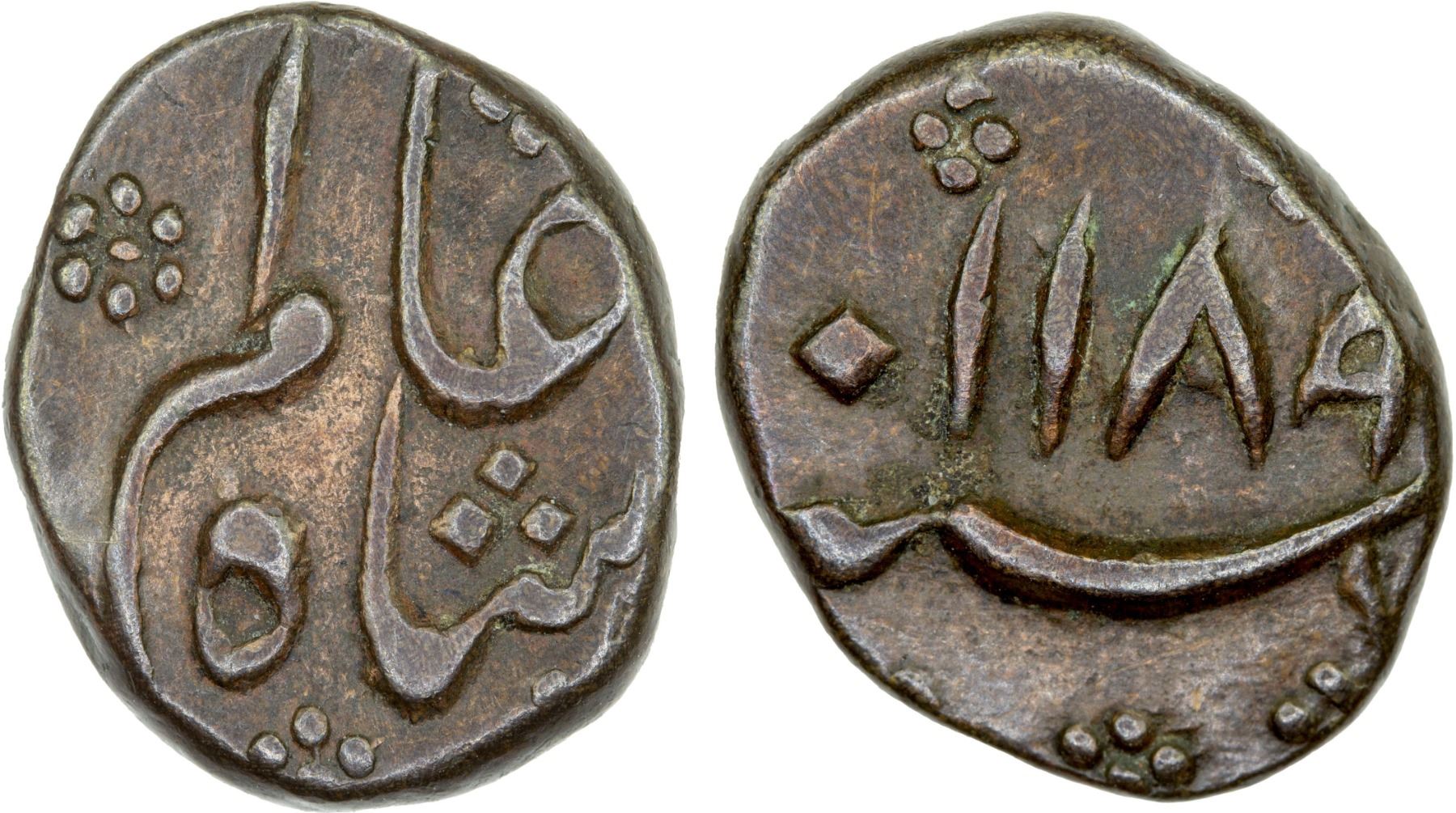 ARCOT: Nawabs of Arcot, AE 2 cash (3.02g), AH1189 (1775), KM-, Ganesh-14.8, inscribed just shah 'alam on the obverse, sana 1189 on the reverse; bold strike, choice XF, RR. Attribution to the Nawabs of Arcot is tentative.