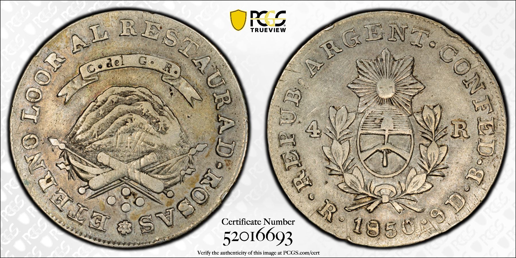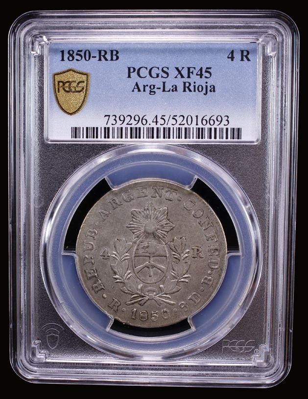 ARGENTINA: Confederation, AR 4 reales, La Rioja, 1850, KM-20, assayer RB, PCGS graded EF45.