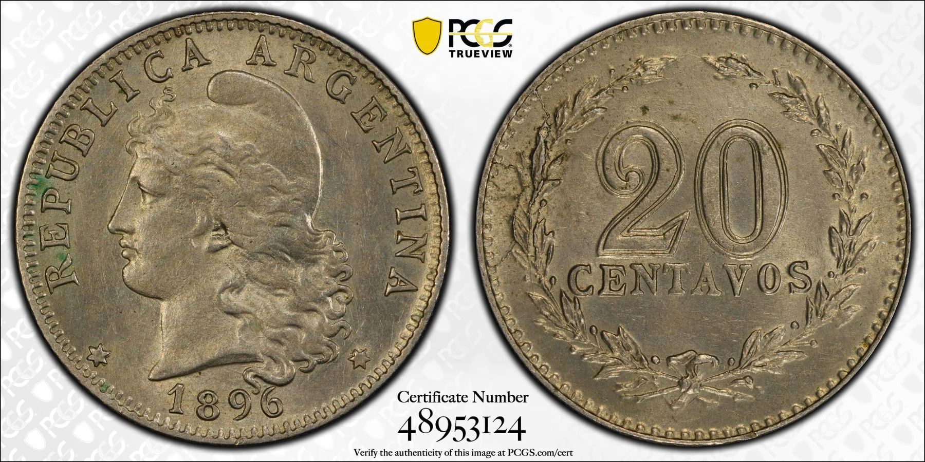 ARGENTINA: Republic, 20 centavos, 1896, KM-36, a lovely lustrous example! PCGS graded MS63.