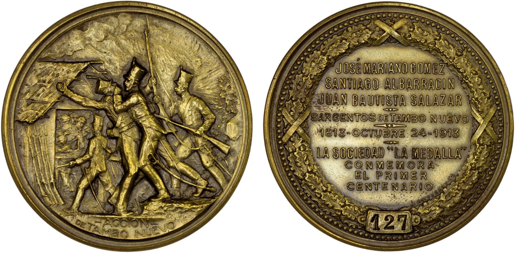 ARGENTINA: Republic, AE medal (39.97g), 1913, 45mm numbered bronze medal on the Centennial of the Tambo Nuevo Action by Gottuzzo and Ca. for La Medalla Society, military scene with raid on buliding at left, 4 bayonets laying against building, and ACCION / DE TAMBO NUEVO in exergue // JOSE MARIANO GOMEZ / GANTIAGO ALBARRACIN / JUAN BAUTISTA SALAZAR / SARGENTOS DE TAMBO NUEVO / 1813 OCTUBRE 24-1913 / LA SOCIEDED "LA MEDALLA" / CONMEMORA / EL PRIMER / CENTENARIO, all within oak wreath with "127" inscribed in cartouche at bottom, plain edge, Choice AU.