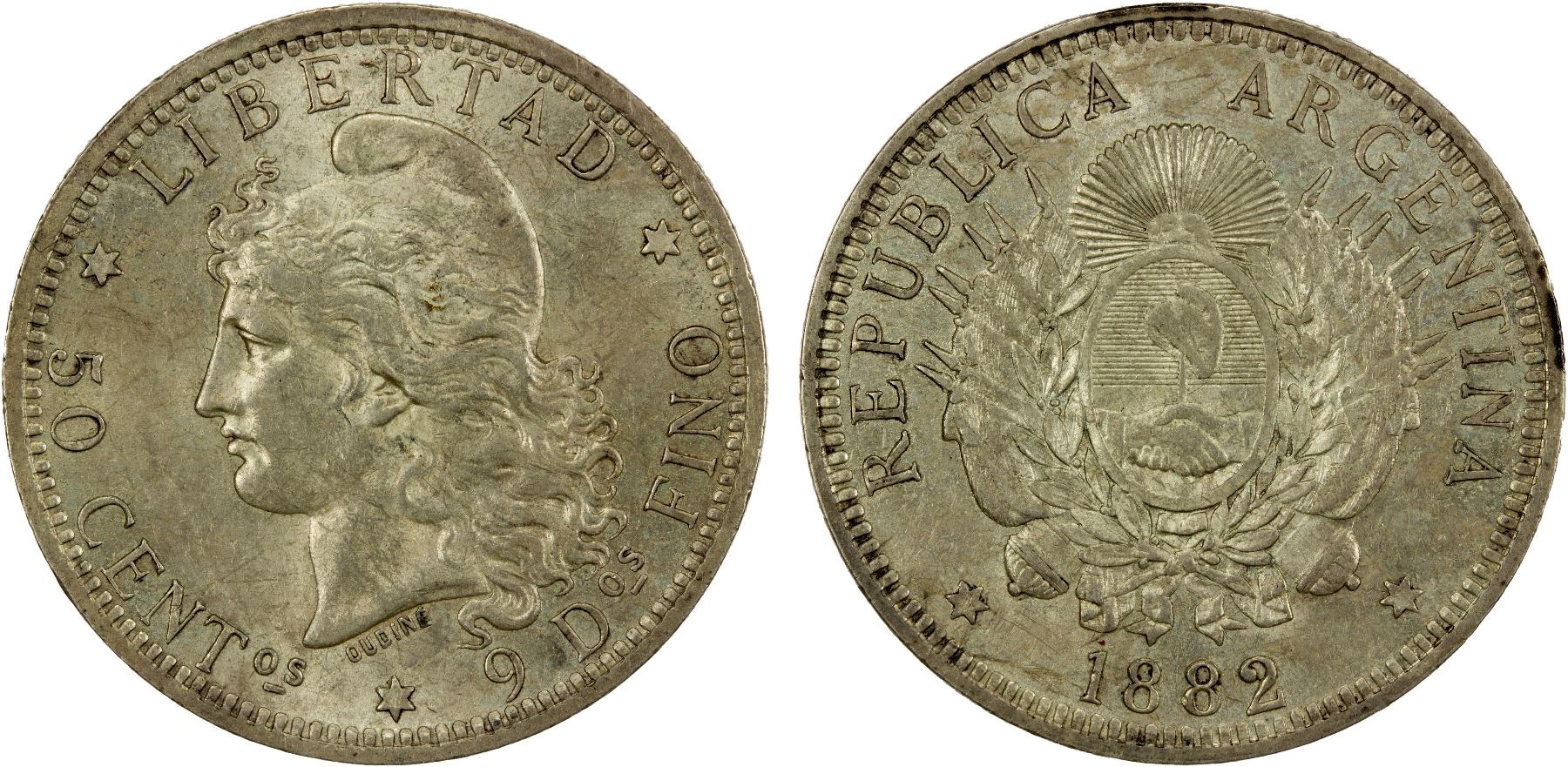 ARGENTINA: Republic, AR 50 centavos, 1882, KM-28, almost full original luster, Choice About Unc, ex Charles W. Lueders Collection.