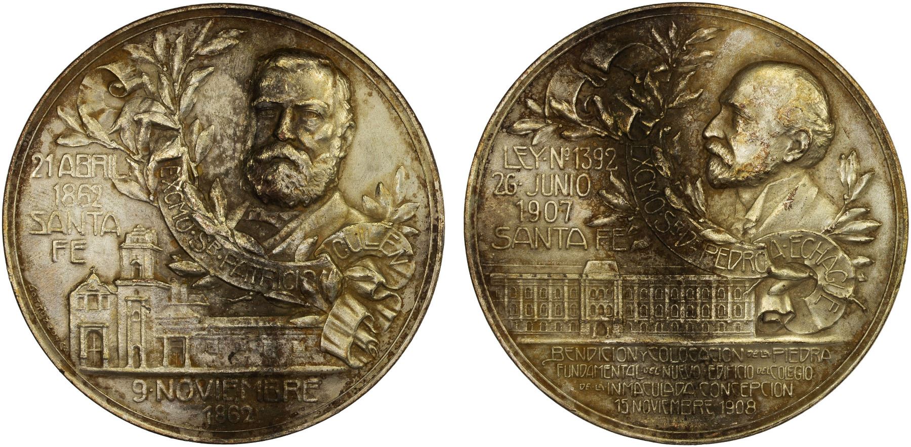 ARGENTINA: Republic, AR medal (116.9g), 1908, 65mm silver medal for the Laying of the Cornerstone of the New Immaculate Conception College Building in Santa Fe by Gottuzzo and Ca., bust left with laurel and banner to left and below reading EXCMOS Sr Dr PEDRO A ECHAGUE, with LEY No1392 / 26 JUNIO / 1907/ SANTA FE at left, building below, and "BENDICION Y COLORACION DE LA PIEDRA / FUNDAMENTAL DEL NUEVA EDIFICIO DE COLLEGIO / DE LA INMACULADA CONCEPCION / 15 NOVIEMBRE 1908" in exergue // facing bust with laurel and banner at left and below reading EXCMO Sr PATRICIO CULLEN and 21 ABRIL / 1862 / SANTA / FE at far left, building below, and "9 NOVIEMBRE /1862" in exergue, unevenly toned, plain edge, AU.