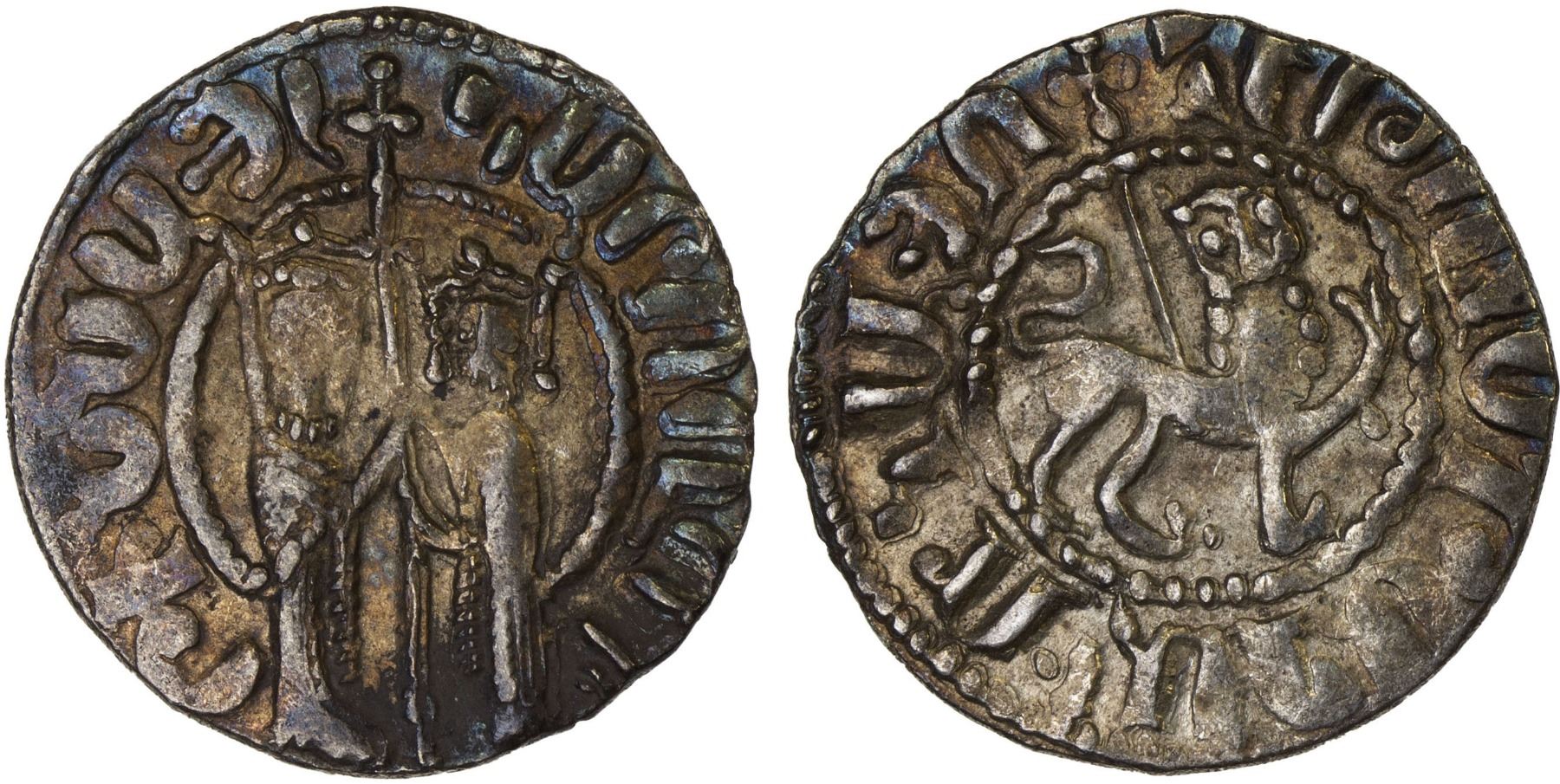 ARMENIA: Hetoum I, 1226-1270, AR tram (2.93g), Queen Zabel and King Hetoum standing, both holding long cross between them // lion standing right, holding cross behind with left foreleg, XF.