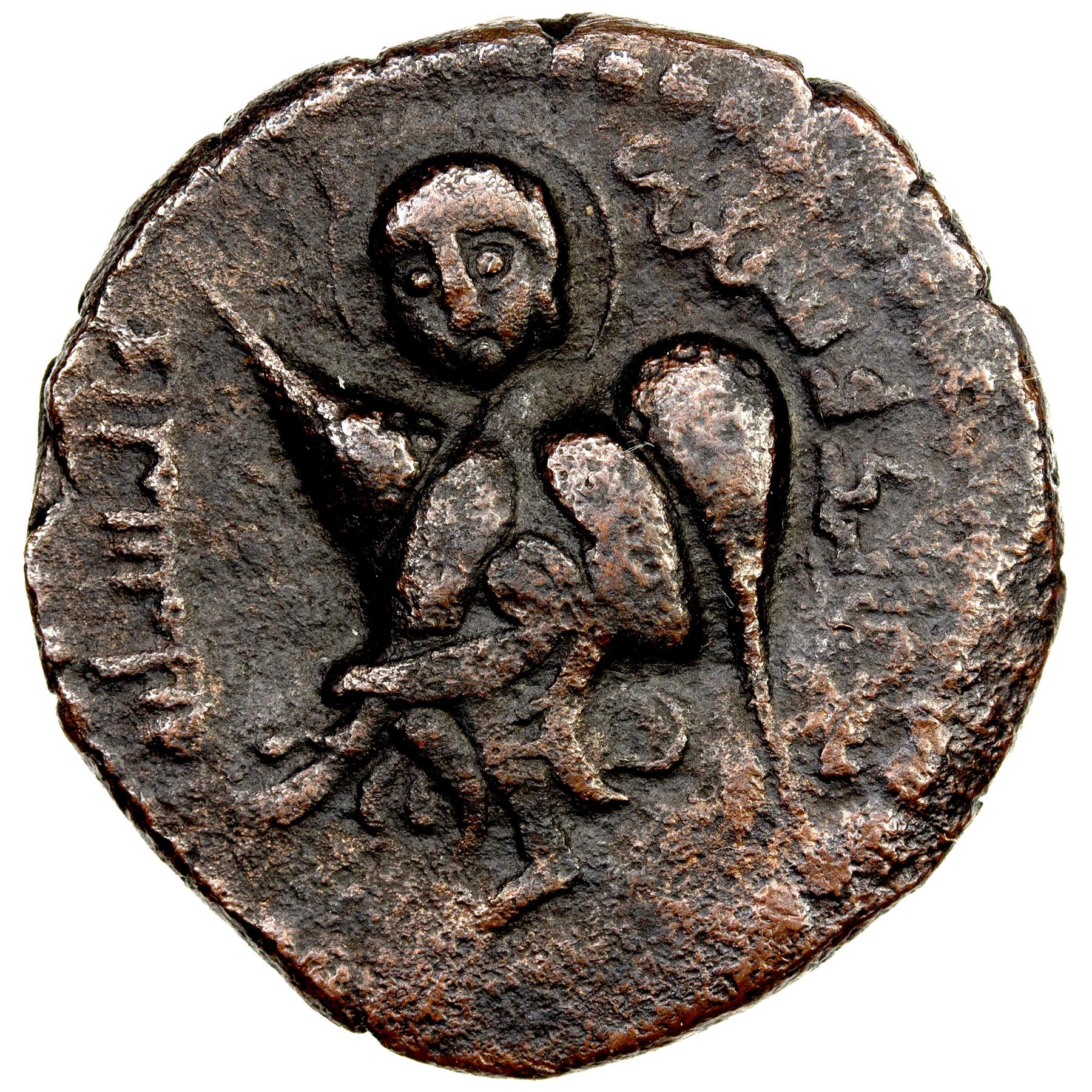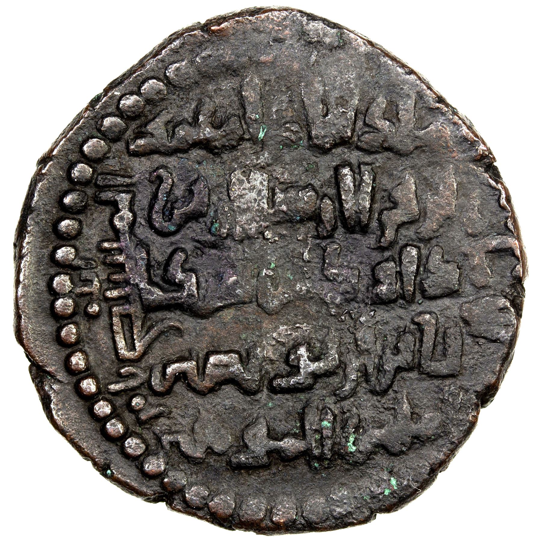 ARTUQIDS OF AMID & KAYFA: Nur al-Din Muhammad, 1174-1185, AE dirham (13.56g), AH571, A-1821.1, nimbate winged angel facing, right wing raised, above average quality for this type with full reverse legends, VF.