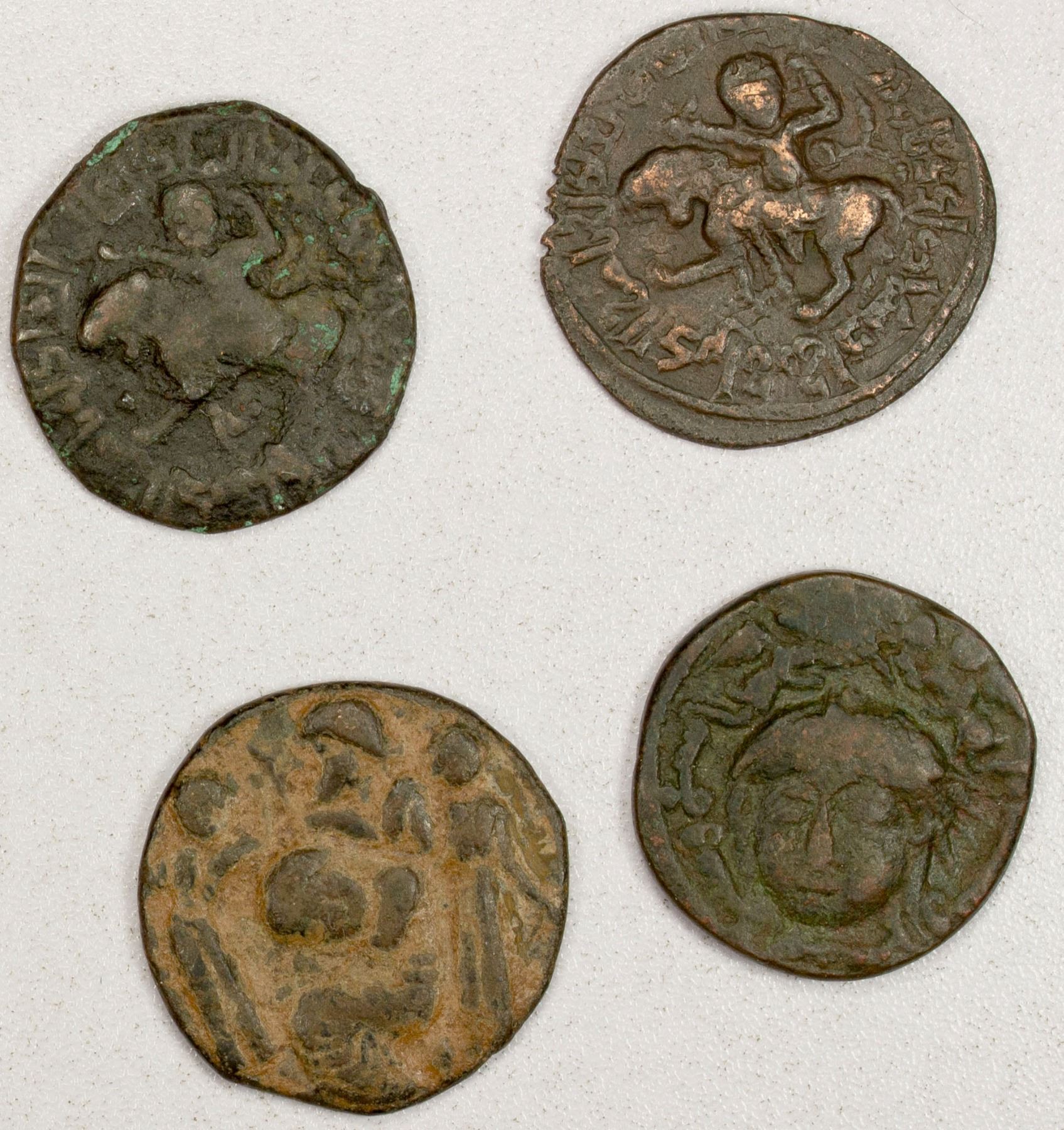 ARTUQIDS OF MARDIN: LOT of 4 pictorial AE dirhams, including 1) AH589, A-1829.3, SS-35.2, scene of lamentation // 5-line inscriptions, F-VF; 2) AH606, A-1830.3, SS-39, leopard-rider, VF; 3) another of the same type, VG-F, spots of corrosion; plus 4) one of Ghazi II of the Zangids of al-Mawsil, AH567, A-1861.1, SS-60, bust 3/4 left, F-VF; retail value $350, lot of 4 pieces.
