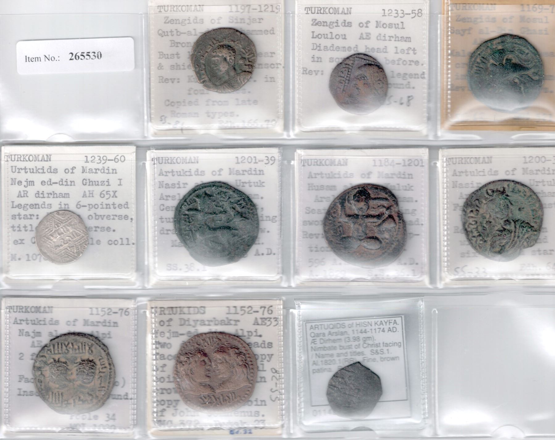 ARTUQIDS & ZANGID:LOT of 9 silver and 1 copper coins: Artuqid: Qara Arslan: A-1820.1, SS-1 (G-VG); Alpi : A-1827.3, SS-28 (bold VF), and A-1827.5, SS-30 (choice VF); Yuluq Arslan: A-1829.1, SS-33 (Fine), and 1829.4, SS-36.1 (Good); Artuq Arslan: A-1830.2, SS-38.1 (VF); and Ghazi I: A-1834.5, AR dirham, date off (VF); and Zangid: Mas'ud I: A-1863.1, SS-62 (F-VF); Lu'lu': A-1874.1, SS-68 (Fine); and Qutb al-Din Muhammad: A-1880.2, SS-81 (nearly VF); retail value $525, lot of 10 pieces.
