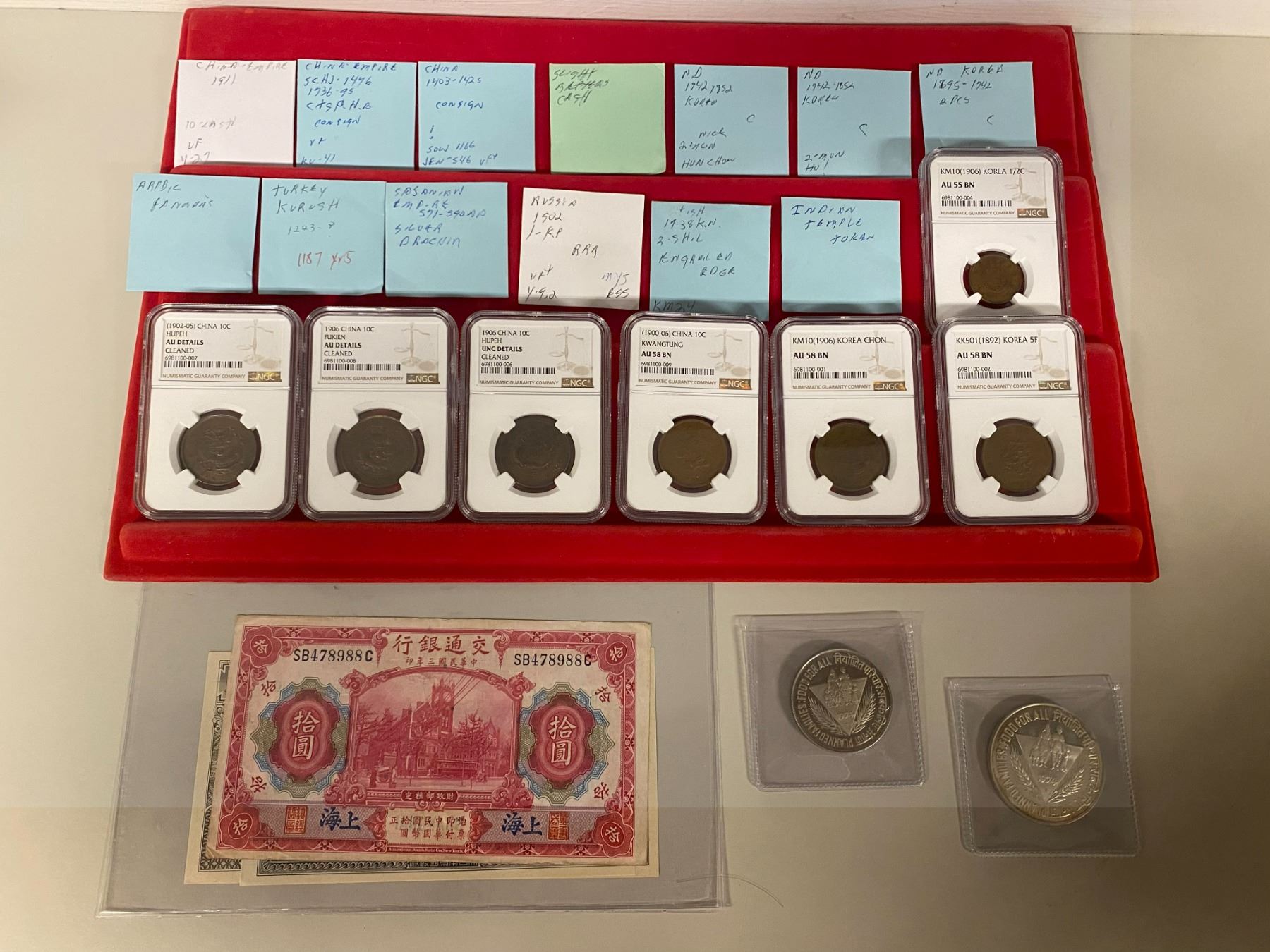 ASIA: LOT of 31 items, including China (11): 5 machine-struck 10 cash (four in NGC holders, AU to Unc, some cleaned), and 6 cash coins (all Qing except one Ming, one countermarked with initials HB); Korea (7): 3 machine-struck coppers (NGC AU55-58), and 4 Sang Pyong 2-cash; India (6): 1974 proof AR 50 & 10 rupees (FAO), 3 medieval coins and a temple token; plus 4 other coins (Sasanian, Ottoman Turkey, British West Africa, Russian Empire) and 3 banknotes (Shanghai 1914 10 yuan, plus two Japanese military notes); most coins in average condition for their type; retail value $550, lot of 31 pieces.