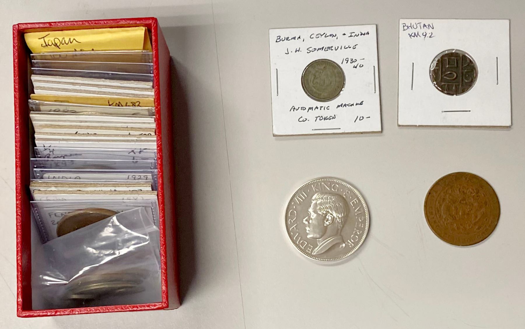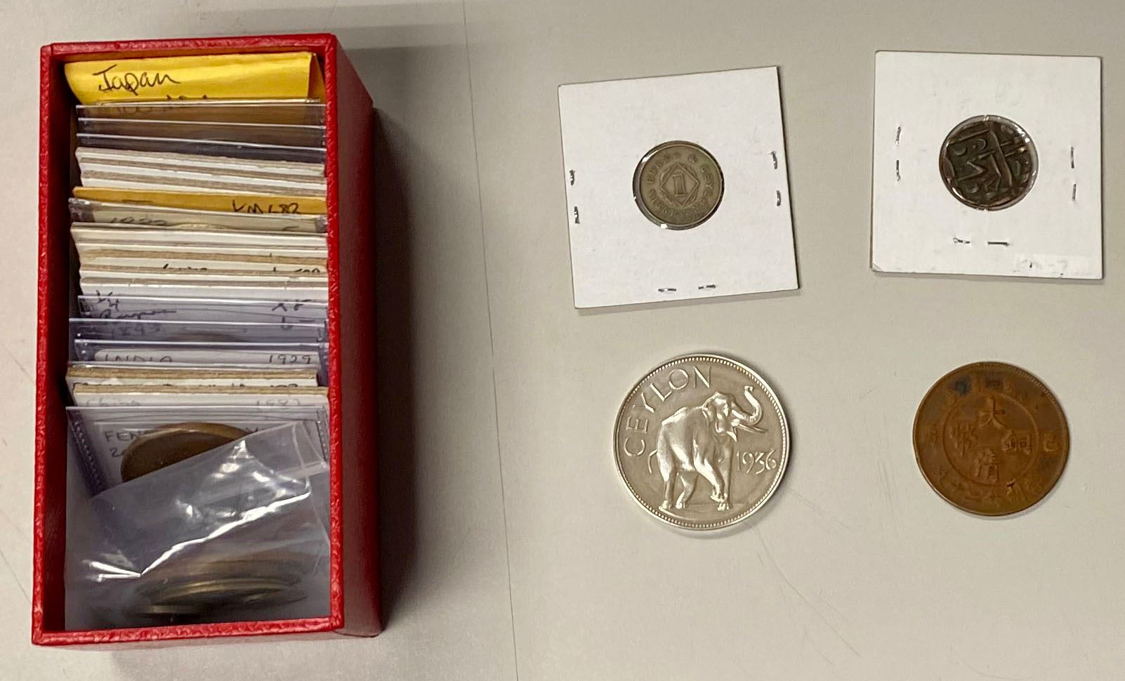 ASIA: LOT of 39 coins and tokens, including Bhutan (1 pc), Burma (& Ceylon & India) (1, token), Ceylon (1), China/Empire (6), China/Fengtien (1), China/Reformed Govt. of China (2), China/People's Republic (1), French Indochina (1), Hong Kong (2), Indian States/Gwalior (1), India/British (3), India/Republic (1), India/Temple Tokens (2), Indonesia (1), Iran (2), Iraq (3), Islamic Dynasties/Umayyad and Abbasid (6), Israel (1), and Japan (3); average circulated grades, with some uncs, many in silver, in consignor's holders, viewing recommended; retail value $1025, lot of 39 items.