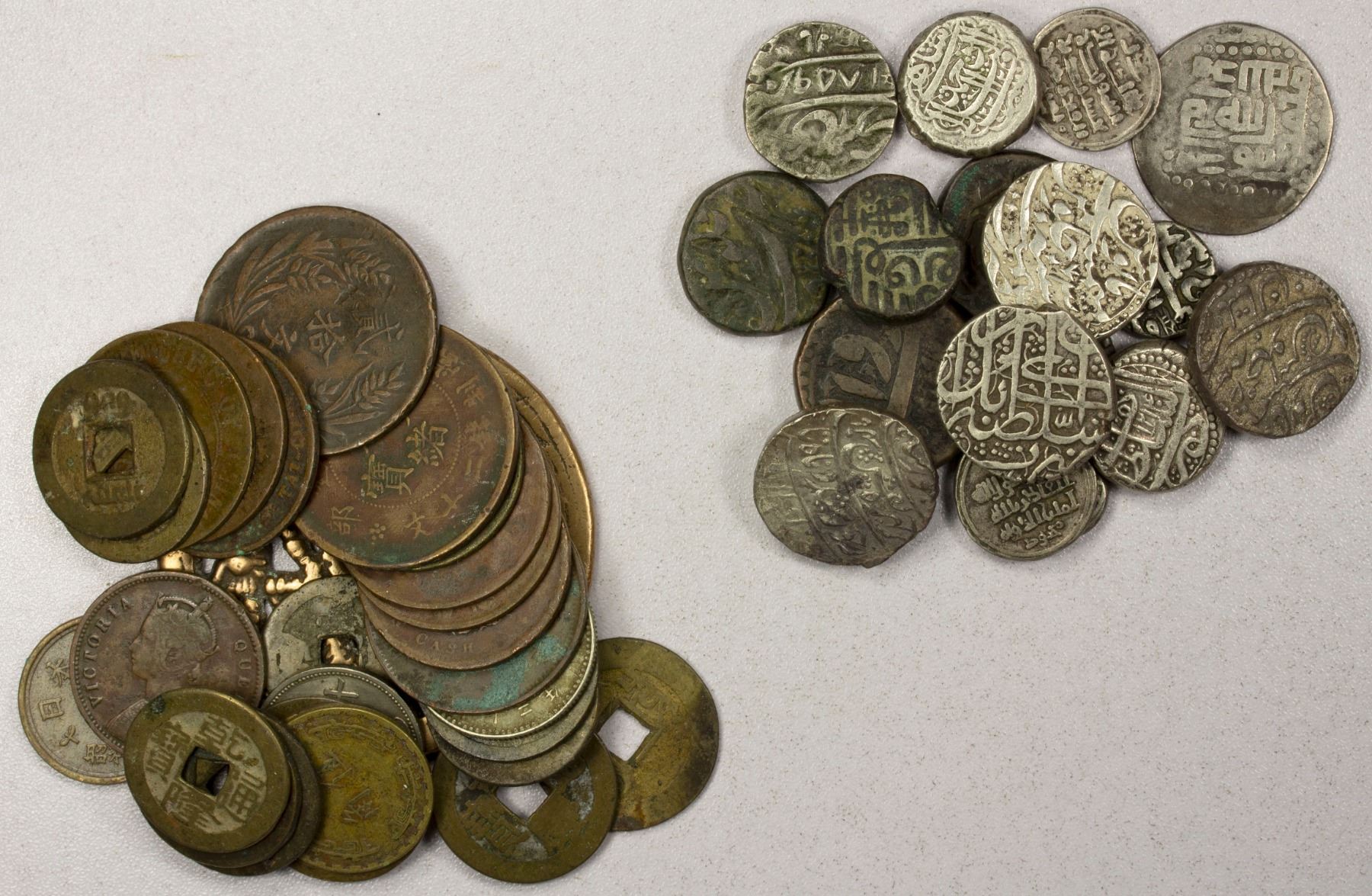 ASIA: LOT of 46 coins, including India (5, incl. Sikh rupee VS1859 Amritsar), Afghanistan (7, incl. Taimur Shah rupee Peshawar AH(11)94/8, Shah Zaman Kashmir AH1211), Medieval Islamic (6, incl. two Ghaznavid yamini dirhams, one legible date AH395, a tanka of Timur/Tamerlane, and a Bukhara tenga of Haidar), plus 28 pieces from East Asia (mostly Qing cash coins and struck 10 cash coins, incl. an openwork dragon charm, polished); retail value $500, lot of 46 pieces.