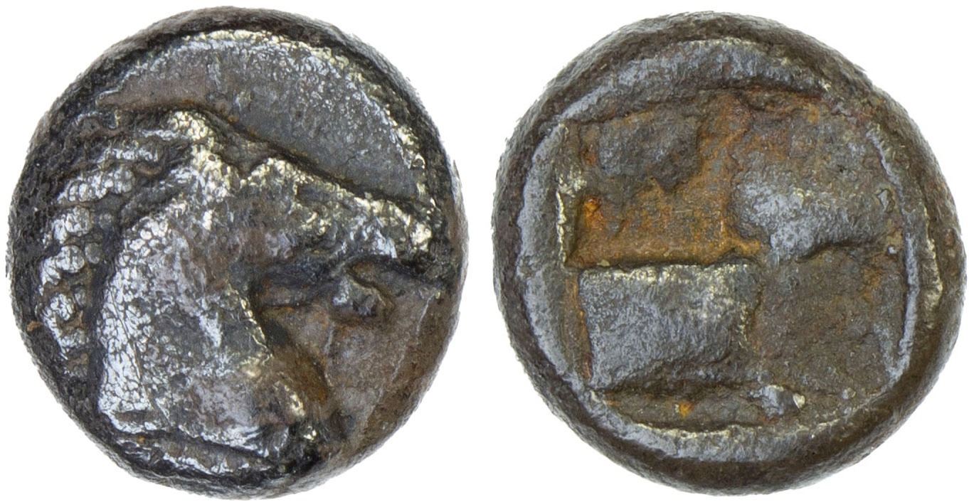 ASIA MINOR: Uncertain Mint, AR obol (0.79g), 5th century BC, cf. Klein 332 (hemiobol), issued in Western Asia Minor, possibly from Kyme, head of horse right // quadripartite incuse square, toned, VF, ex James Lamb Collection, ex Busso Peus e-Auction 8, Lot 94.