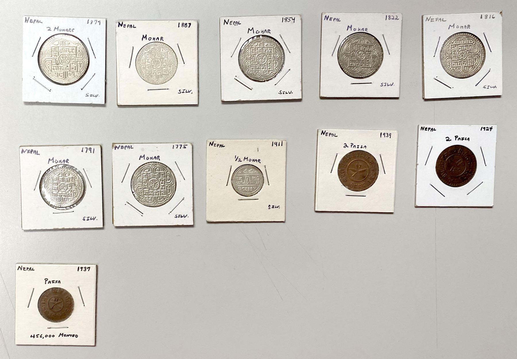 ASIA: Nepal, LOT of 11 coins, including copper 1 paisa 1937 UNC, 2 paisa 1924 EF-AU, 2 paisa 1939 UNC, silver ½ mohar 1911 AU, 1 mohar 1775 EF, 1791 EF, 1816 EF, 1822 EF, 1854 EF, 1887 AU, 2 mohars 1879 EF, an attractive group of high quality coins all attributed in 2x2 holders, retail value $350, lot of 11 coins.
