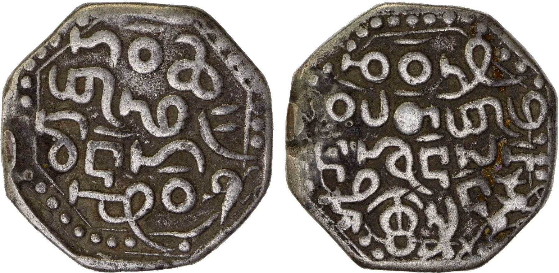 ASSAM: Gadadhara Simha, 1681-1696, AR rupee (10.77g), ND, KM-33, RB-E6, octagonal, cyclical year 33, lion // bird walking at the right, light oxidation, bold strike, F-VF.