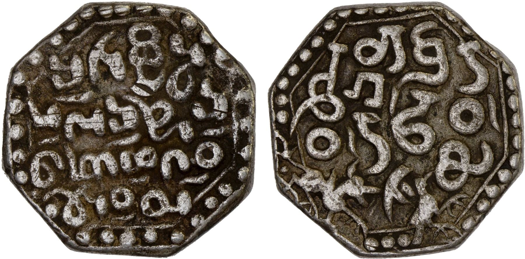 ASSAM: Gadadhara Simha, 1681-1696, AR rupee (11.04g), ND, KM-30, RB-4.1, octagonal, Ahom script both sides; bird at the lower left and lion at lower right of the obverse, rare, F-VF.