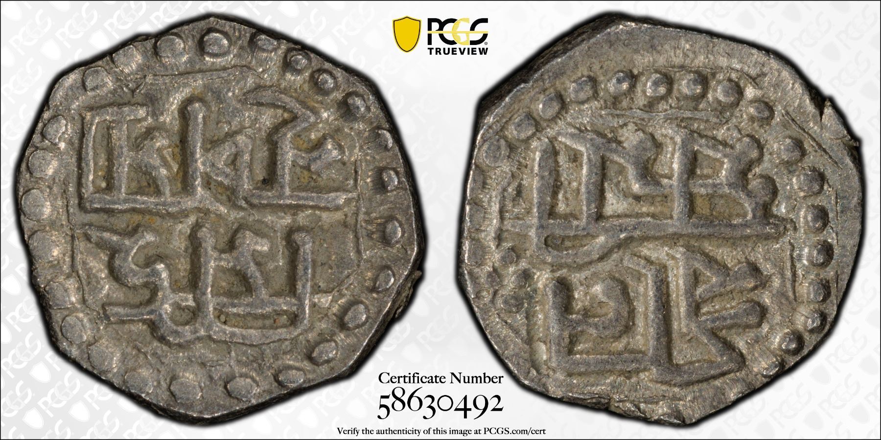 ASSAM: Lakshmi Singha, 1769-1780, AR 1/16 rupee (0.72g), ND (1769-80), KM-174, R&B-Q 60.1, PCGS graded AU58.