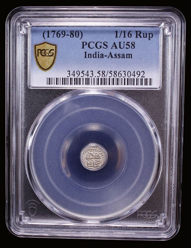 ASSAM: Lakshmi Singha, 1769-1780, AR 1/16 rupee (0.72g), ND (1769-80), PCGS AU58