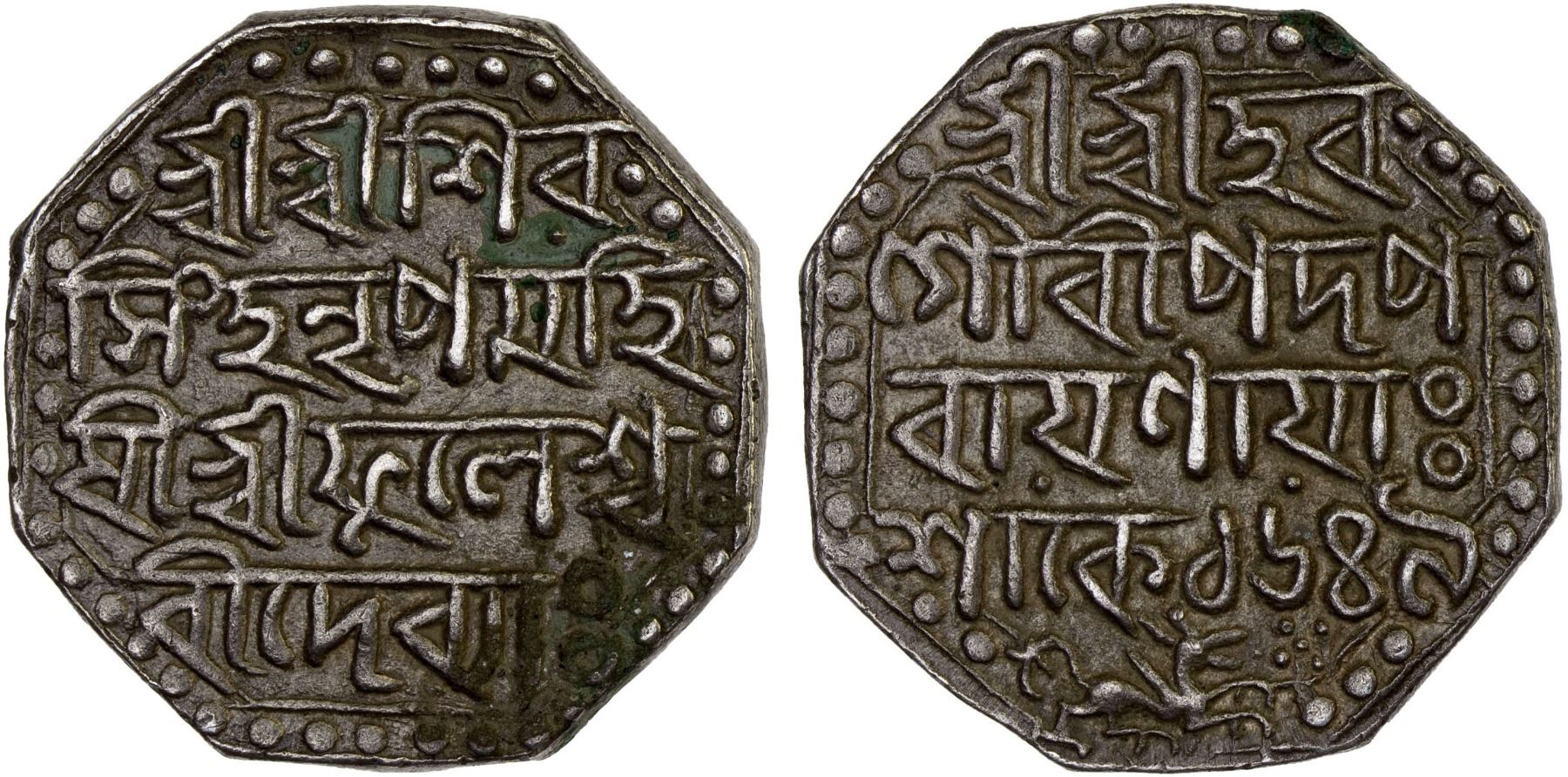 ASSAM: Shiva Simha, 1715-1741, AR rupee (11.48g), SE1649, KM-61, citing the Queen Phulesvari; superb strike, some minor discoloration, choice XF.