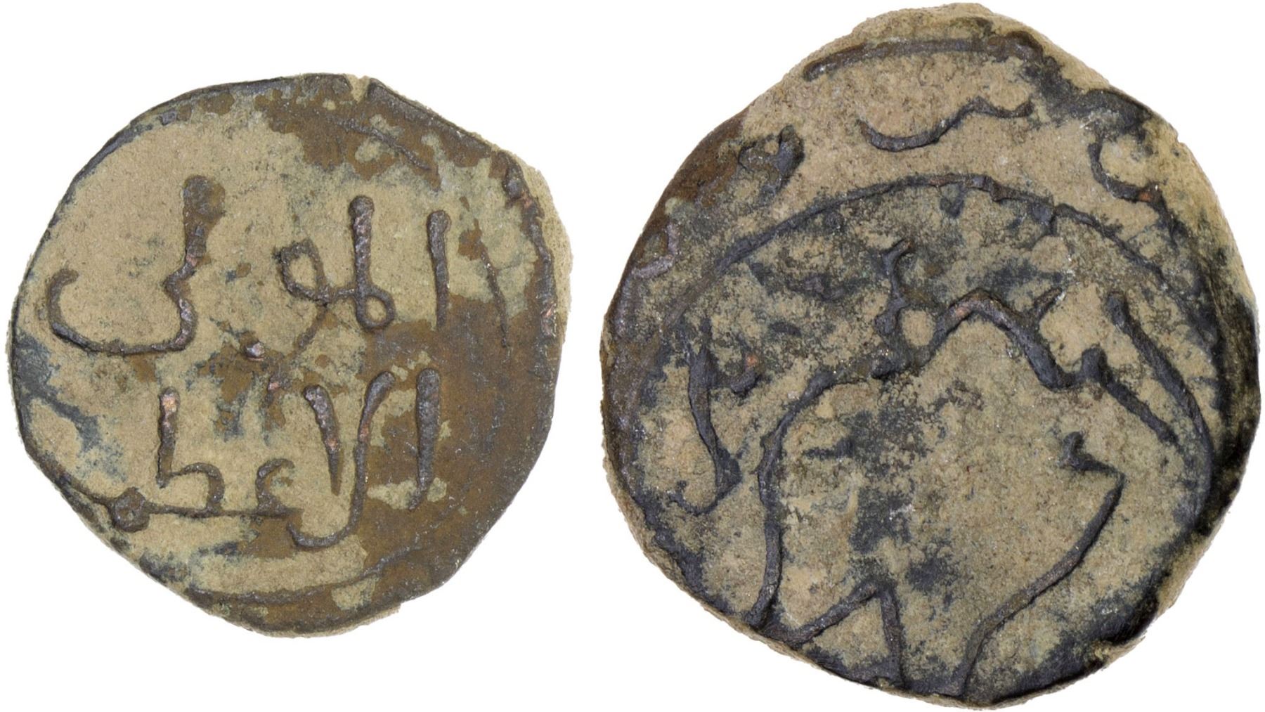 ASSASSINS AT ALAMUT (BATINID): Muhammad III, 1221-1254, AE fals (2.00g), NM, ND, A-1921I, obverse legend al-mawla / al-a'zam // bird right, formed out of the name letters for muhammad bin al-hasan; traces of a margin legend on the reverse, VF.