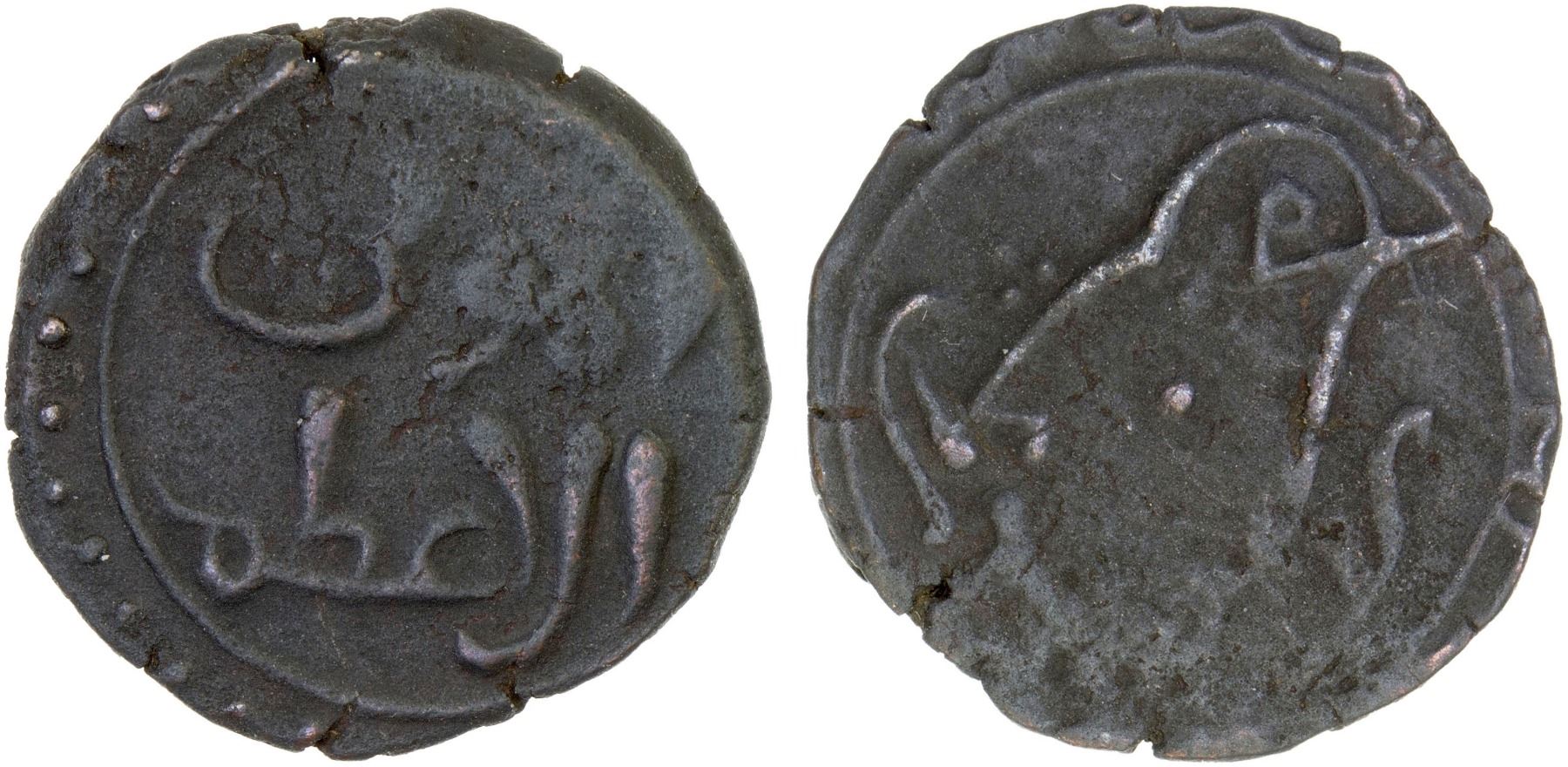 ASSASSINS AT ALAMUT (BATINID): Muhammad III, 1221-1254, AE fals (2.10g), NM, ND, A-1921I, obverse legend al-mawla / al-a'zam // bird right, formed out of the name letters for muhammad bin al-hasan, presumably struck at Alamut; slight porosity but with all legends and designs fully visible, VF, RRR.