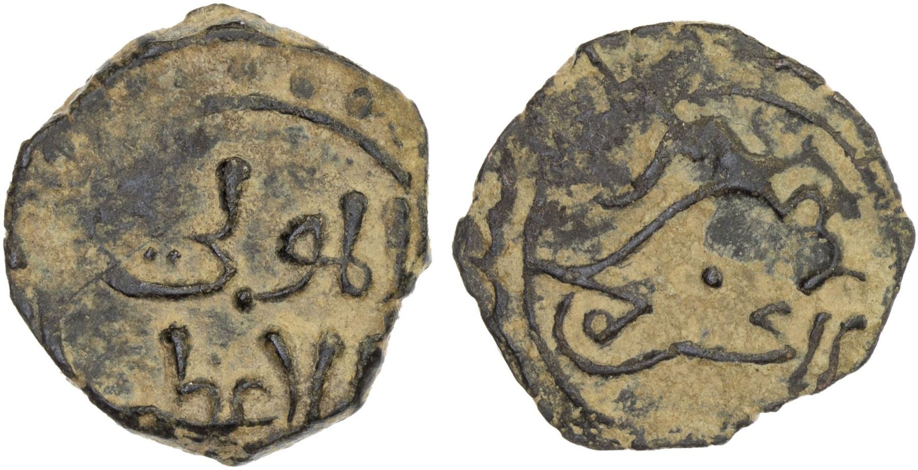 ASSASSINS AT ALAMUT (BATINID): Muhammad III, 1221-1254, AE fals (2.13g), NM, ND, A-1921I, obverse legend al-mawla / al-a'zam // bird right, formed out of the name letters for muhammad bin al-hasan; traces of a margin legend on the reverse, VF.
