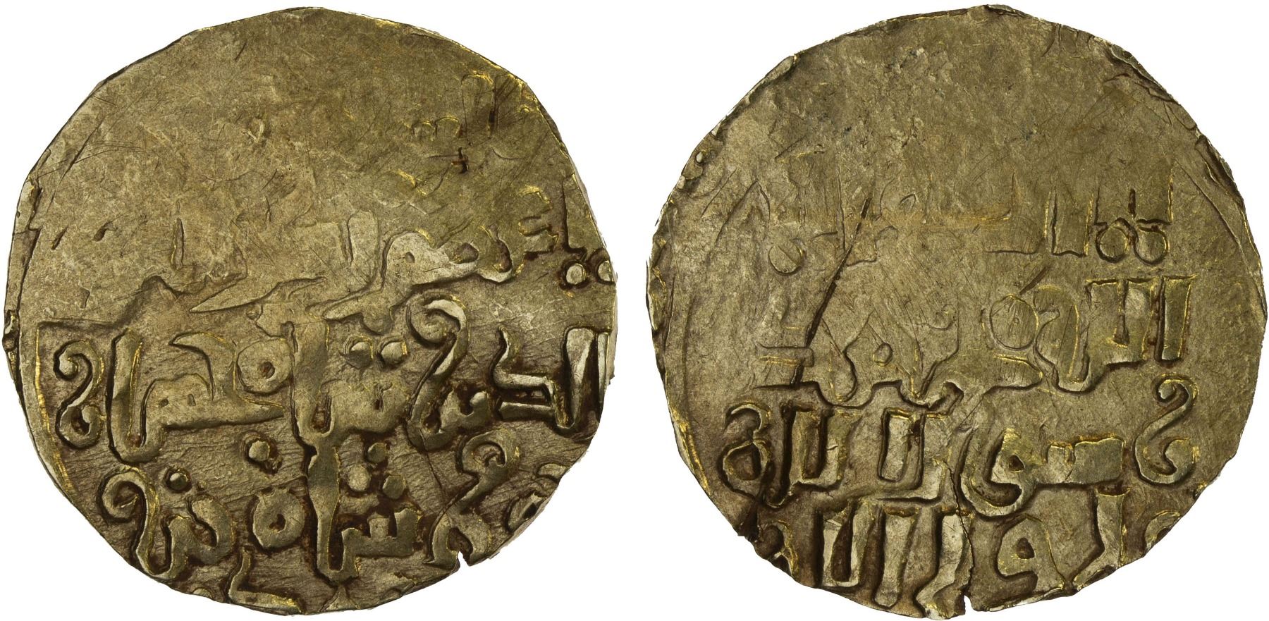 ASSASSINS AT ALAMUT (BATINID): Rukn al-Din Khurshah b. Muhammad, 1255-1256, AV dinar (4.38g), MM, DM, A-1921R, ruler cited as al-sultan al-a'zam rukn al-dunya wa'l-din shah jahan khurshah bin muhammad, with the Shi'ite kalima on the reverse, some weakness; this is the second known coin of the last Batinid ruler Khurshah (the first, struck from the same pair of dies, was sold in our Auction 51, lot 382, about the same grade and also about 15% flat strike), crude XF, RRRR. Khurshah was the unfortunate final ruler of the Assassins, defeated by the Mongol forces led by Hulagu. Surprisingly, the Mongols agreed to bring Khurshah to the great Khan Möngke, but after a short time he was executed somewhere in the eastern Mongol territories, later in 1256.
