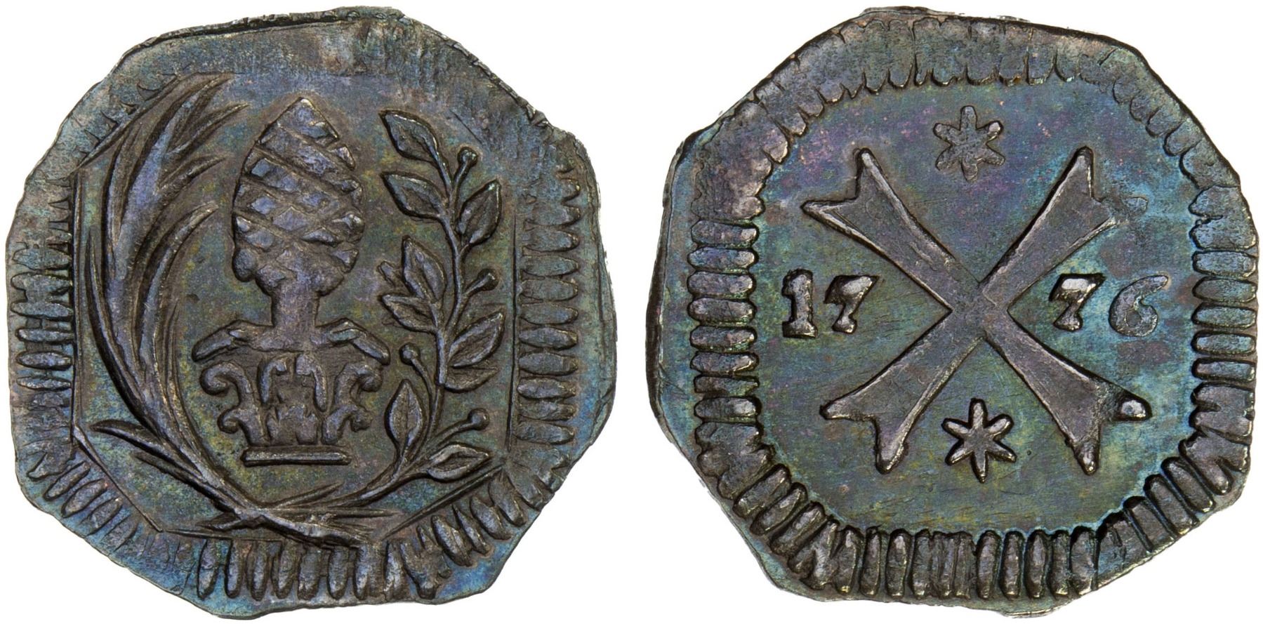 AUGSBURG: Free City, AR heller (0.47g), 1776, as KM-151, as Craig-1a.1, klippe type in silver, wonderful bluish and multicolored toning, popular year of U.S. Independence, Choice AU, ex Almer H. Orr III Collection.
