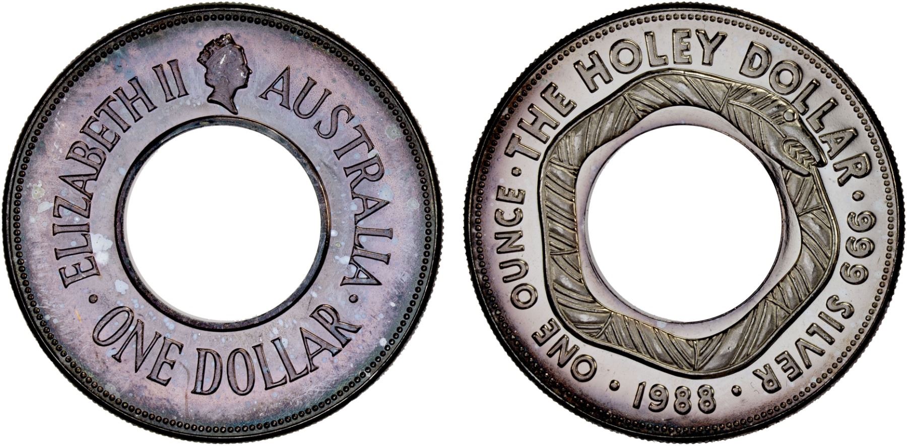 AUSTRALIA: Elizabeth II, 1952-2022, AR dollar, 1988, KM-112, The Holey Dollar - Yulunggul, the Rainbow Serpent, Proof.