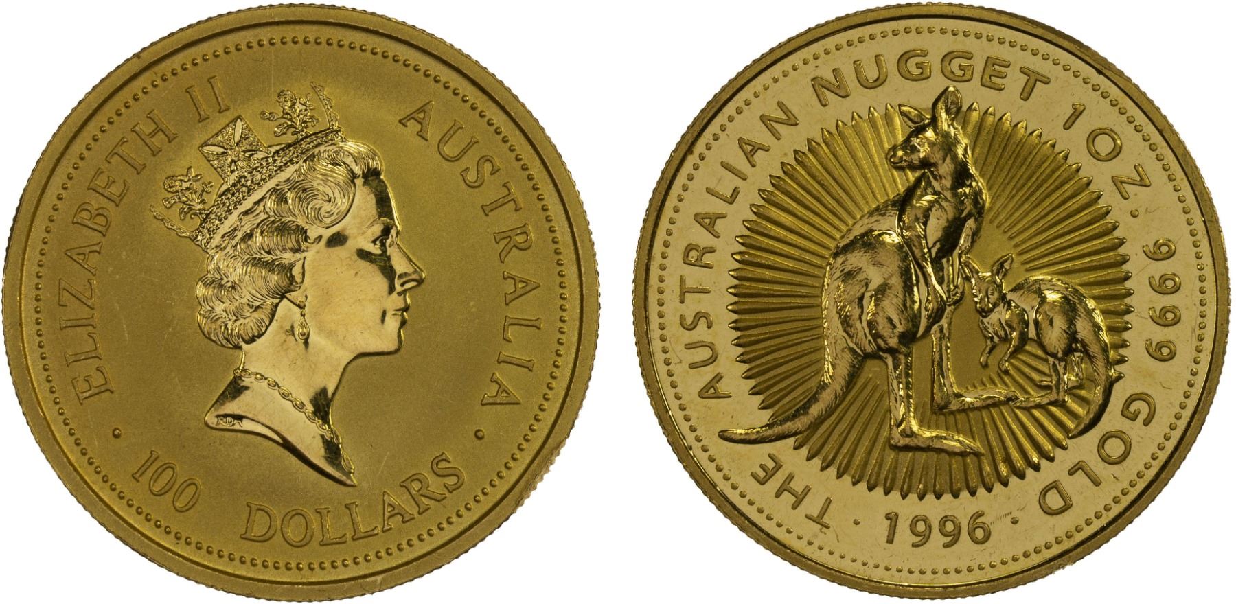 AUSTRALIA: Elizabeth II, 1952-2022, AV 100 dollars, 1996, KM-342, Australian Gold Nugget Bullion Series - Kangaroo, struck at the Perth mint, contains 1 troy ounce pure gold, BU, ex Syed Rabbi Collection.