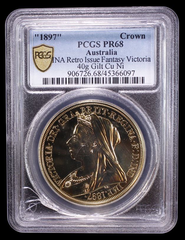 AUSTRALIA: Fantasy Issues, 1 crown, "1897", INA Retro Fantasy "Veiled Head" type of Victoria, struck in gilt copper-nickel, International Numismatic Agency(INA) issue, PCGS graded Proof 68. The International Numismatic Agency (INA) struck high quality fantasy British crown coins primarily around 2000–2001, with additional, subsequent strikings reported in 2007 and 2008. These coins are often referred to as "INA Retro Fantasy Issues."