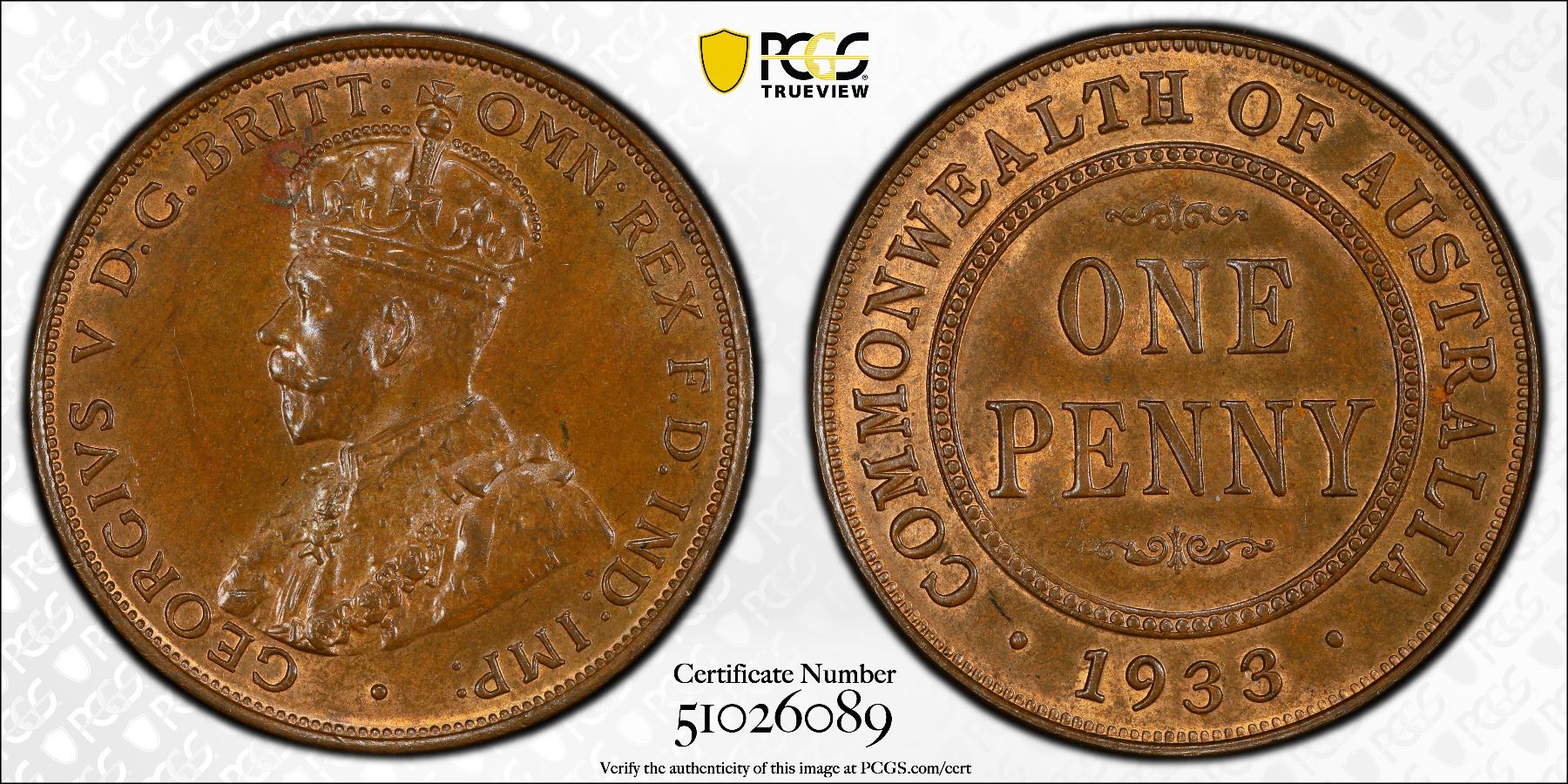 AUSTRALIA: George V, 1910-1936, AE penny, 1933, KM-23, a wonderful example, PCGS graded MS64 BN.