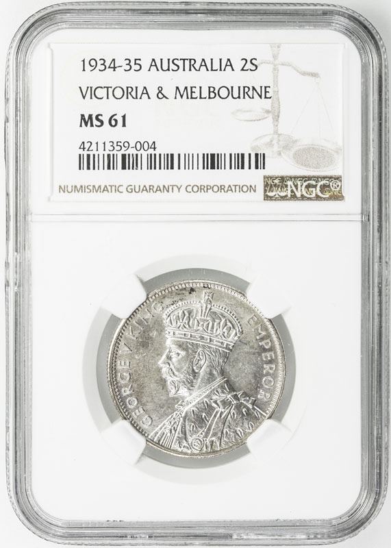 AUSTRALIA: George V, 1910-1936, AR florin, 1934-35, KM-33, Centennary of Victoria & Melbourne, NGC graded MS61.
