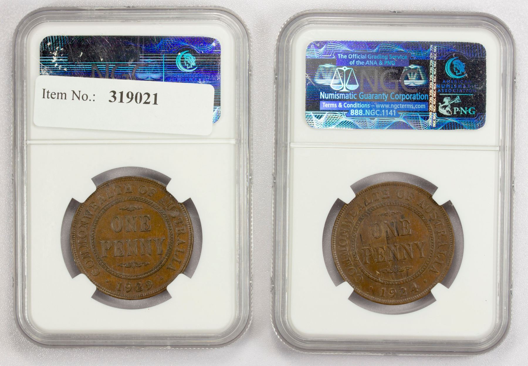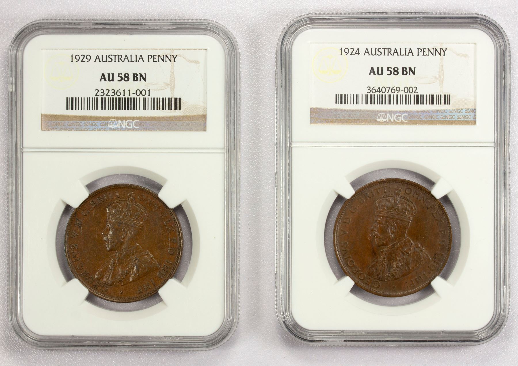 AUSTRALIA: George V, 1910-1936, LOT of 2 NGC-certified coins, KM-23, AE penny 1924 and AE penny 1929; retail value $300, lot of 2 pieces, NGC graded both AU58.