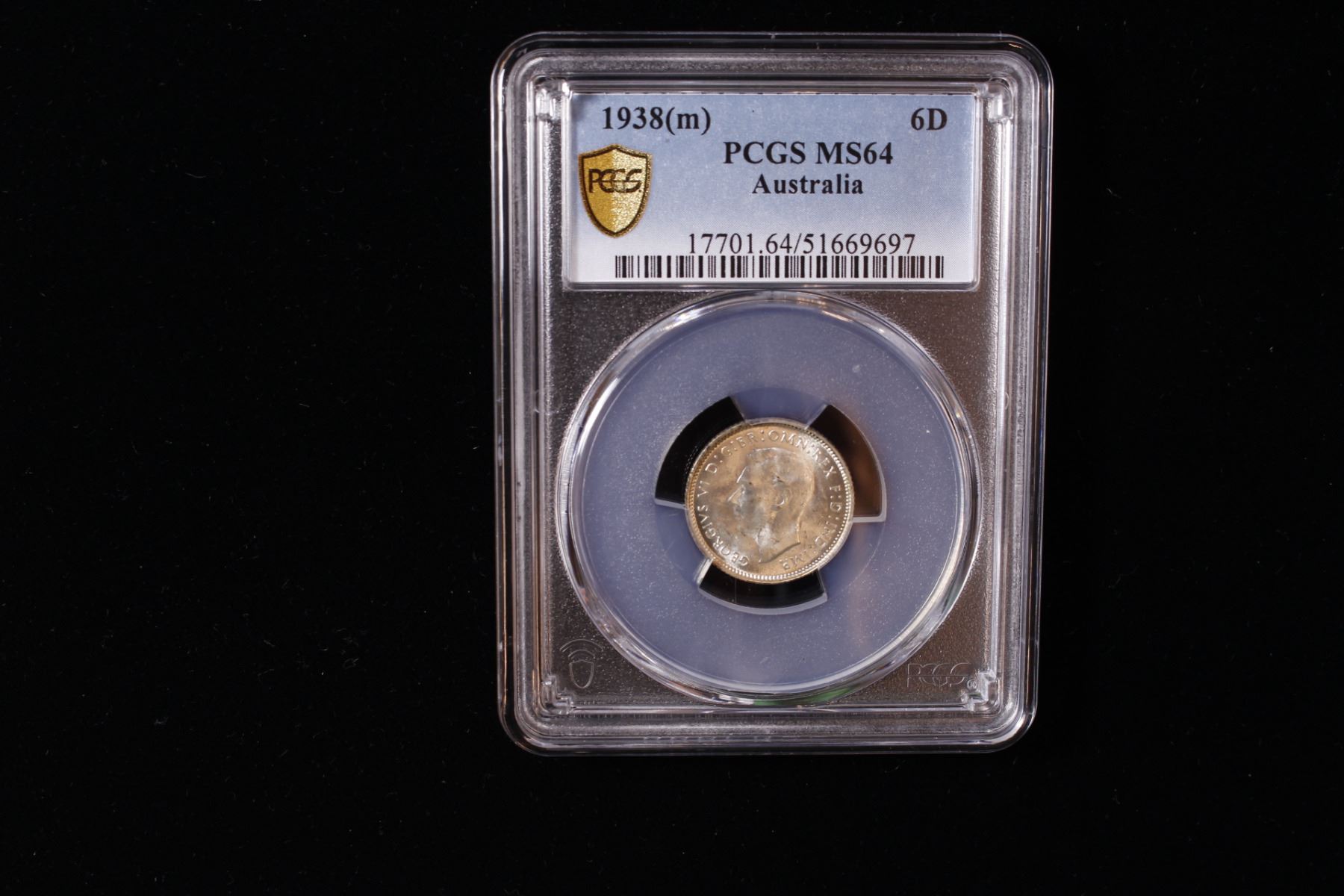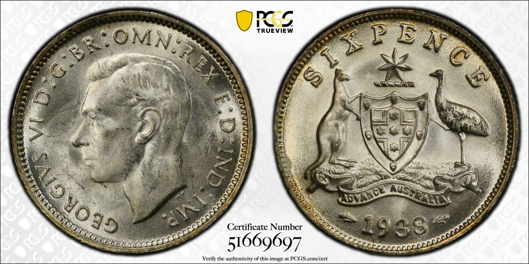 AUSTRALIA: George VI, 1936-1952, AR 6 pence, 1938(m), KM-38, a wonderful lustrous example! PCGS graded MS64.