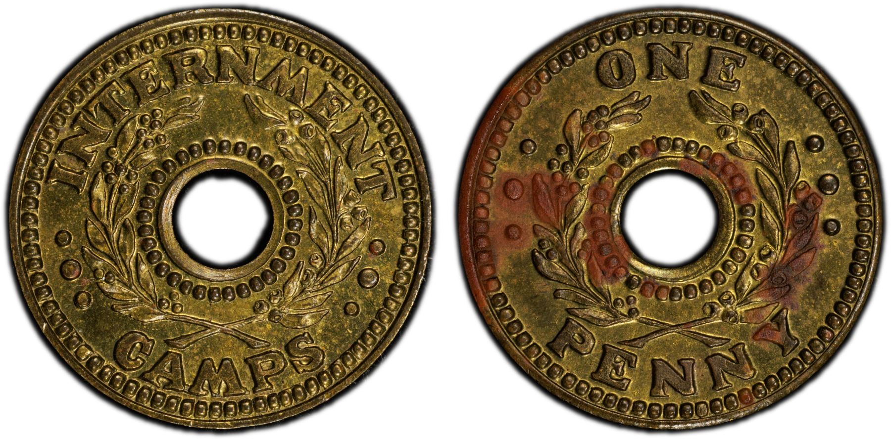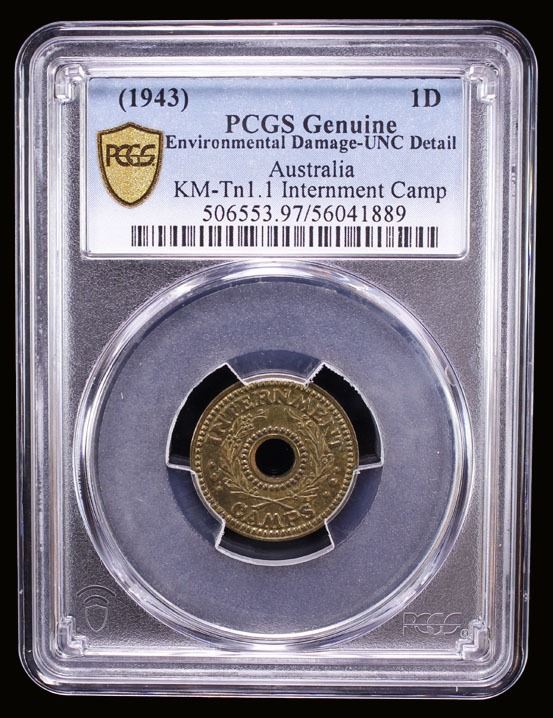 AUSTRALIA: brass penny, ND (1941), KM-Tn1.1, Internment Camp token, some slight staining, PCGS graded Unc details. Issued by the Australian Military Board in 1941, and minted by R. Arendeen & Sons Pty Ltd of Malvern, Victoria.