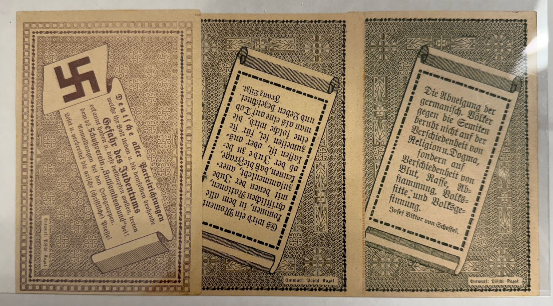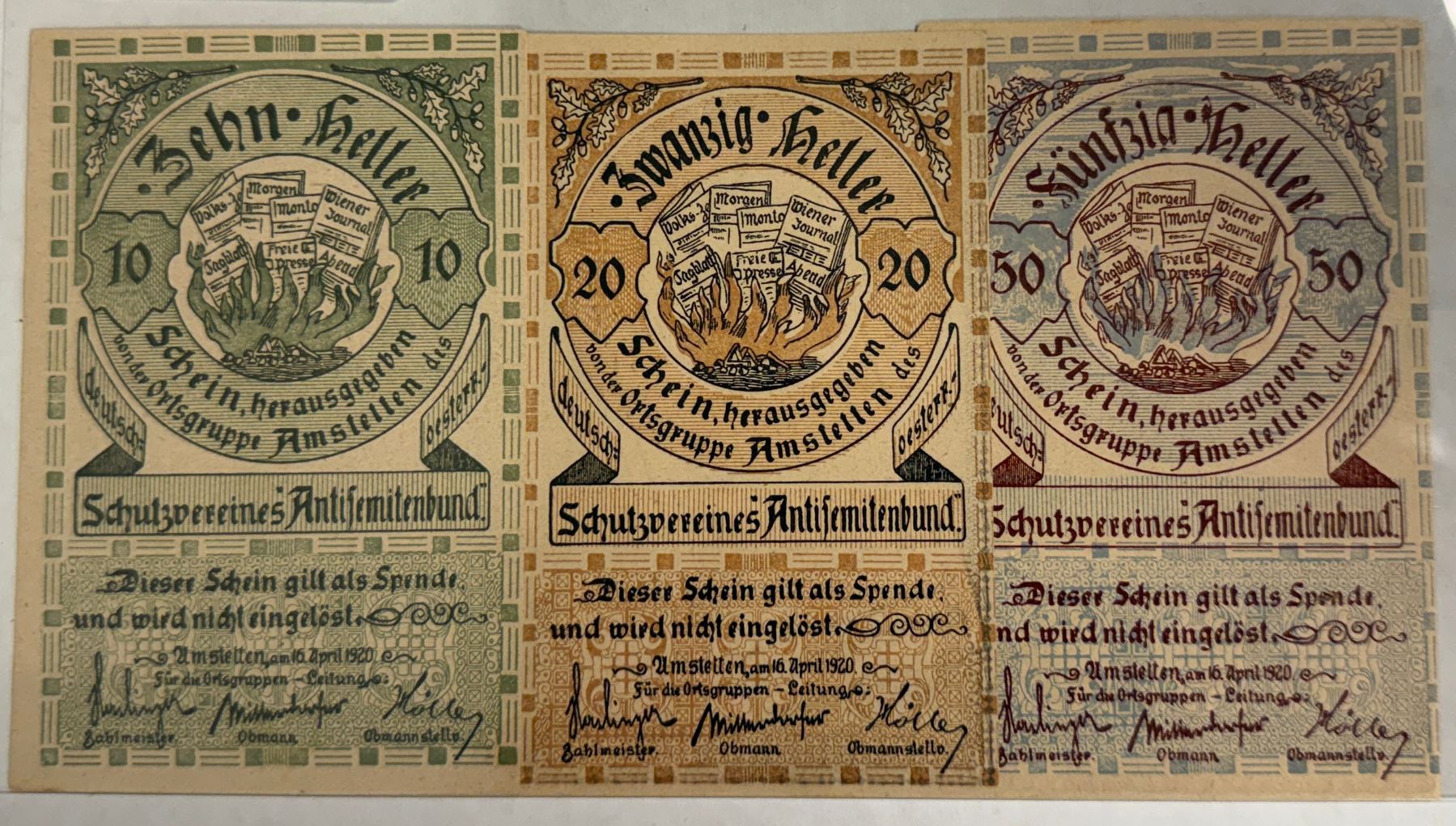 AUSTRIA: 3-note set, 1920, Amstetten, Schutzverein Antisemitenbund, set includes 10 heller JP-R0038-10, 20 heller JP-R0038-20 and 50 heller JP-R0038-50, each note shows an image of seven liberal Austrian newspapers accused of being "Judenpresse" (Jewish press) burning on the face, the 50 heller also has shows a very early use of the swastika as an Anti-Semitic symbol on the back, UNC, set of 3 notgeld. The Deutschösterreichischer Schutzverein Antisemitenbund (German-Austrian Protection Organization "Anti-Semitic League") was founded in 1919 by Christian Social Party politician Anton Jerzabek. Speakers for the group such as Walter Riehl, Josef Ursin, Anton Orel, and Leopold Kunschak demanded expulsion of Jews who arrived in Austria after 1914, registering land ownership for Jews in Vienna, and in Tyrol, extreme anti-Semitic measures such as professional bans and bans on trade and land ownership. Printed organ was Der Eiserne Besen ("The Iron Broom"), printed from 1921-1932 and seen as a forerunner of the Nazi publication Der Stürmer. The Antisemitenbund continued until the Anschluss in 1938 at which time it was dissolved and merged into the NSDAP.This item was originally produced by an organization associated with acts of violence, crimes against humanity, war crimes, extremism, human rights violations, or similar topics. Our firm does not endorse such activities and only offers this item as an artifact of history to further research and civil enlightenment.