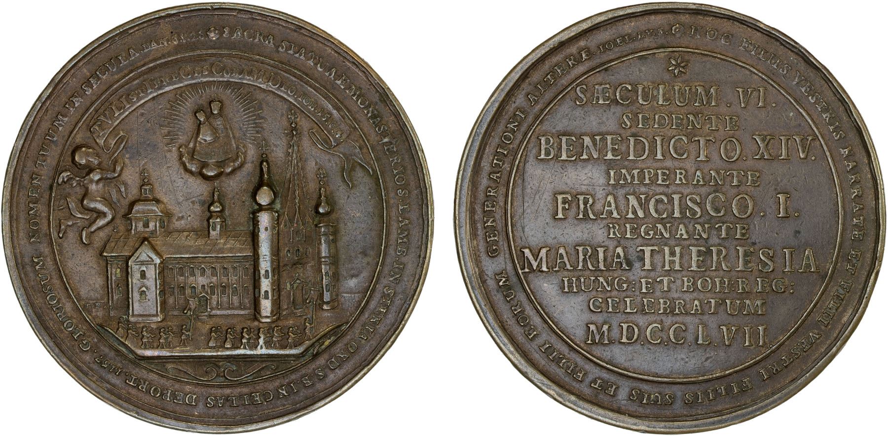 AUSTRIA: AE medal, 1757, Medal for the meeting of Pope Benedict XIV, Holy Roman Emperor Francis I and Maria Theresa in 1757 at Mariazell Basilica, bronze, approx 50mm across, VF.