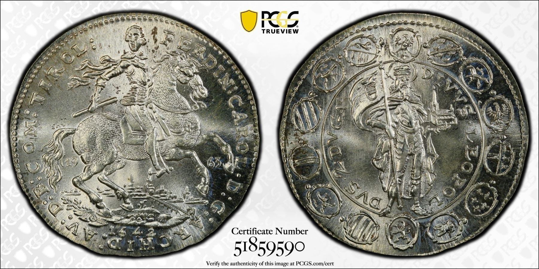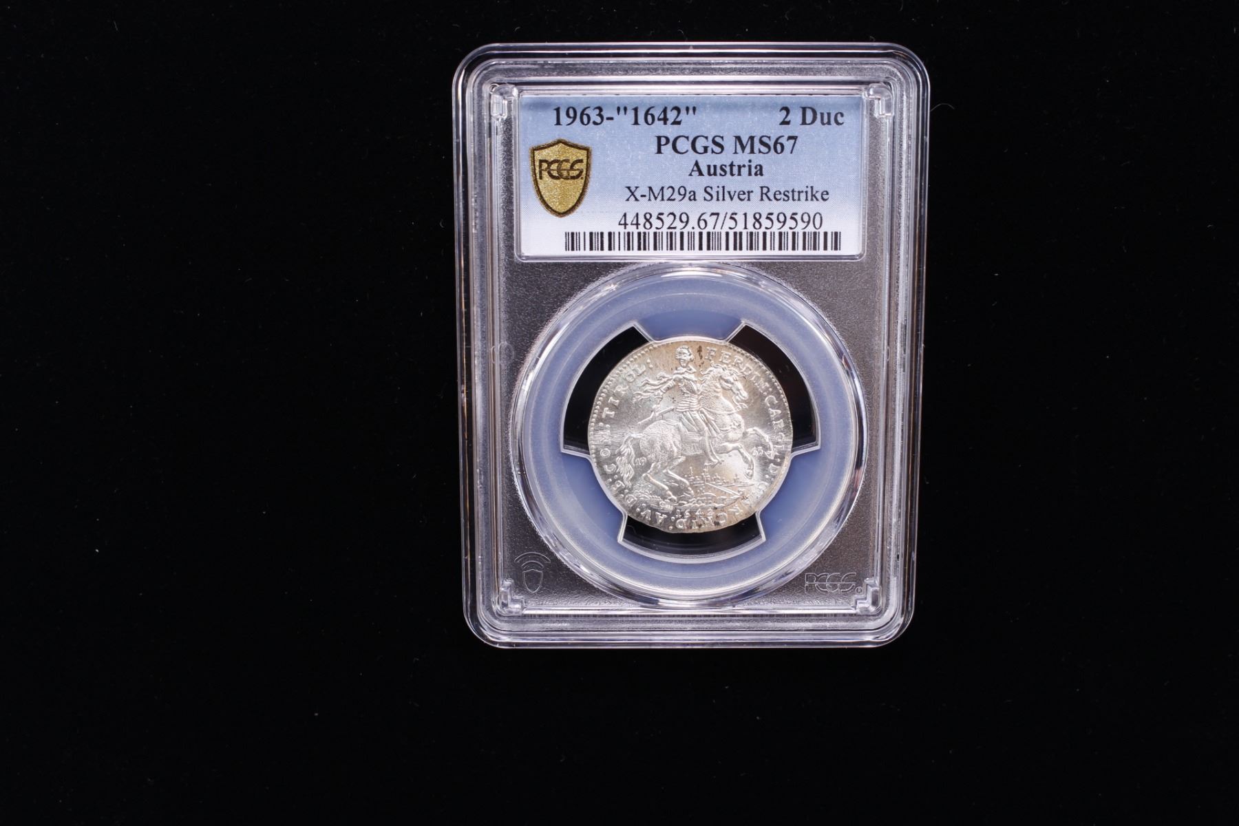 AUSTRIA: AR 2 ducats, 1963, KM-XM29a, Archduke Ferdinand Carol on horseback facing right, Vienna mint restrike, an incredible example, PCGS graded MS67.