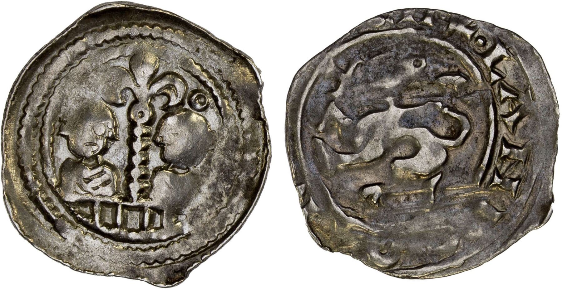 AUSTRIA: CARINTHIA: Bernhard II, 1202-1256, AR pfennig (0.95g), Landstrass, CNA-Cn4, two busts above a wall separated by a palm tree // lion left holding a cross, VF. The Duchy of Carinthia was located in southern Austria and parts of northern Slovenia. It was separated from the Duchy of Bavaria in 976. Carinthia remained a state of the Holy Roman Empire until its dissolution in 1806, though from 1335 it was ruled within the Austrian dominions of the Habsburg dynasty. Bernhard von Spanheim was Duke of Carinthia for 54 years from 1202 until his death in 1256. A patron of chivalry and minnesang (lyric and song writing), Bernhard's reign marked the emergence of the Carinthian duchy as an effective territorial state. This type was minted at the minted at the Kostanjevica Monastery founded by Bernhard von Spanheim at Landstrass.